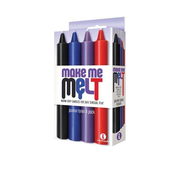 From Icon brands - Perfect for titillating BDSM fun, these wax-play candles have just a tinge of heat when dripped, and then quickly warm to the touch. Make Me Melt Candles are made with 100% paraffin, which is the preferred wax for drip-play. Available in a wide range of beautifully erotic colors, this set features four 6" tapers, in black, blue, red and purple, for colorful drama in a classically sensual, visual experience. Lovers have been enjoying wax play for centuries; experience the sensation!
