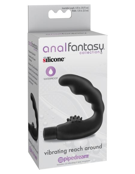 Anal Fantasy Collection Reach Around Vibrating from Pipedream Products. If you have never tried anal play, this Vibrating Reach Around is just what you need to explore the amazing world of anal stimulation. The Vibrating Reach Around features a curved, bulbous shaft perfect for P-Spot stimulation, while the powerful, whisper quiet motor delivers mind blowing vibrations directly to your most sensitive area. The nubs at the base provide external pressure to the perineum that will make you cum harder than ever before! The tapered tip makes insertion a breeze, while the sturdy retrieval handle ensures safe and easy handling. Try filling yourself with the Vibrating Reach Around during other sexual stimulation for a stiffer erection and the strongest, hardest ejaculation. Our ultra hygienic Elite Silicone is phthalate free, hypoallergenic, and can be worn all day for long lasting fun. To power this vibe on and off, simply press the button at the base. Clean up is a snap after the fun with Refresh Anti-Bacterial Toy Cleaner and warm water. Insertion length 4.25 inches. Width 1.25 inches. Categories: Anal Toys, Prostate Massagers, P-Spot Stimulators, Prostate Massagers, G-Spot. 90 days warranty. No video. 2022.