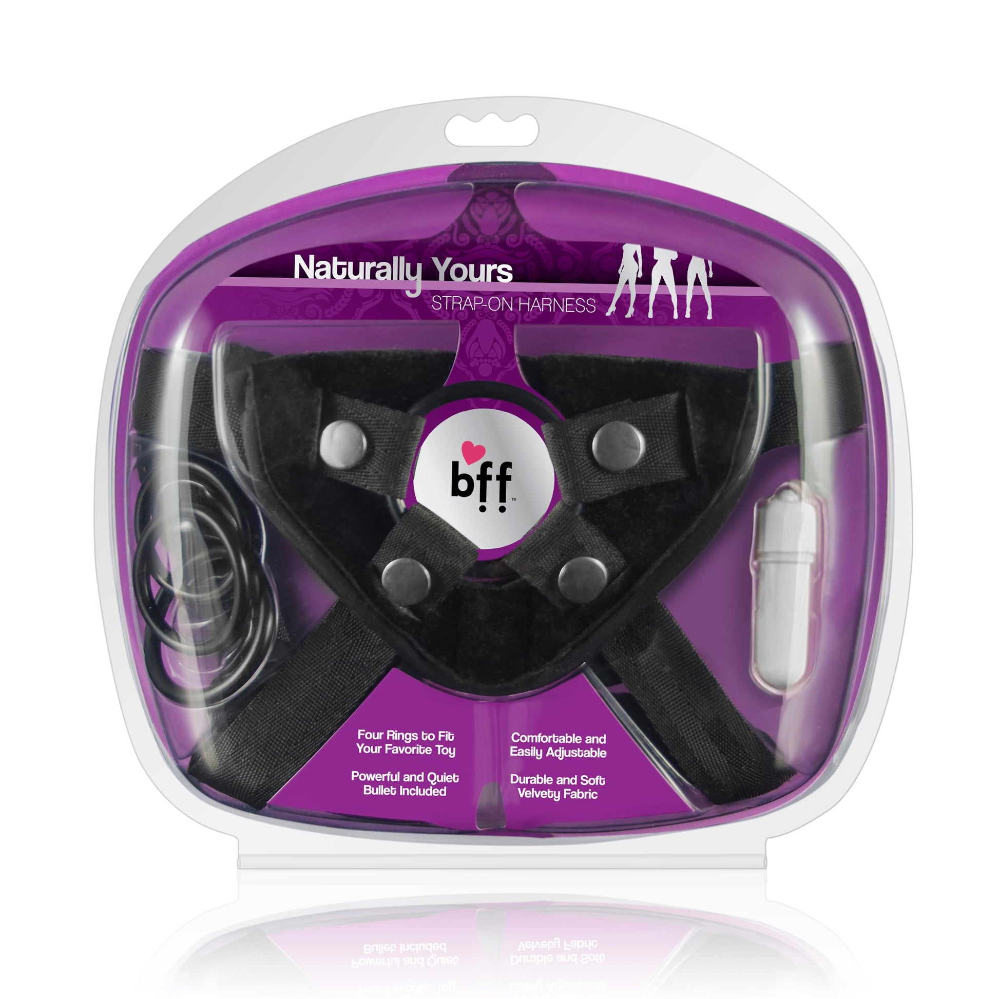BFF Naturally Yours Strap On Harness four rings to hold your sex toys. Easy to change rings with snap in place holder. Comfortably and easily adjustable. One size fits most. Powerful and quiet bullet vibrator included.