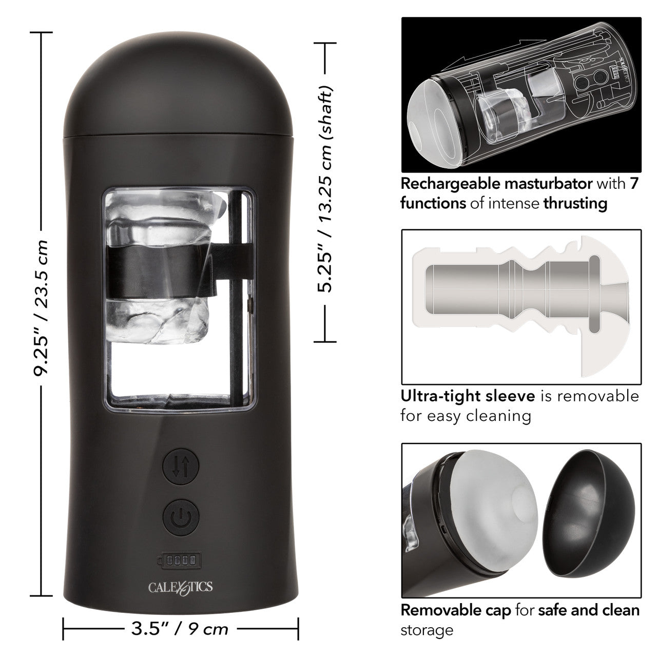 Features: Phthalate free, Rechargeable Vibrations, Vibrates. Measurements: 9.25 inches by 3.5 inches Masturbator Case. 5.25 inches by 3.5 inches Stroker Sleeve. Bulk weight 22 ounces. Package 24 ounces. Package 4.6 inches by 4.6 inches by 10.8 inches. Categories: Male Masturbators, Vibrators, Sex Toys for Men, Rechargeable Vibrators, Solo Masturbators. 2023.