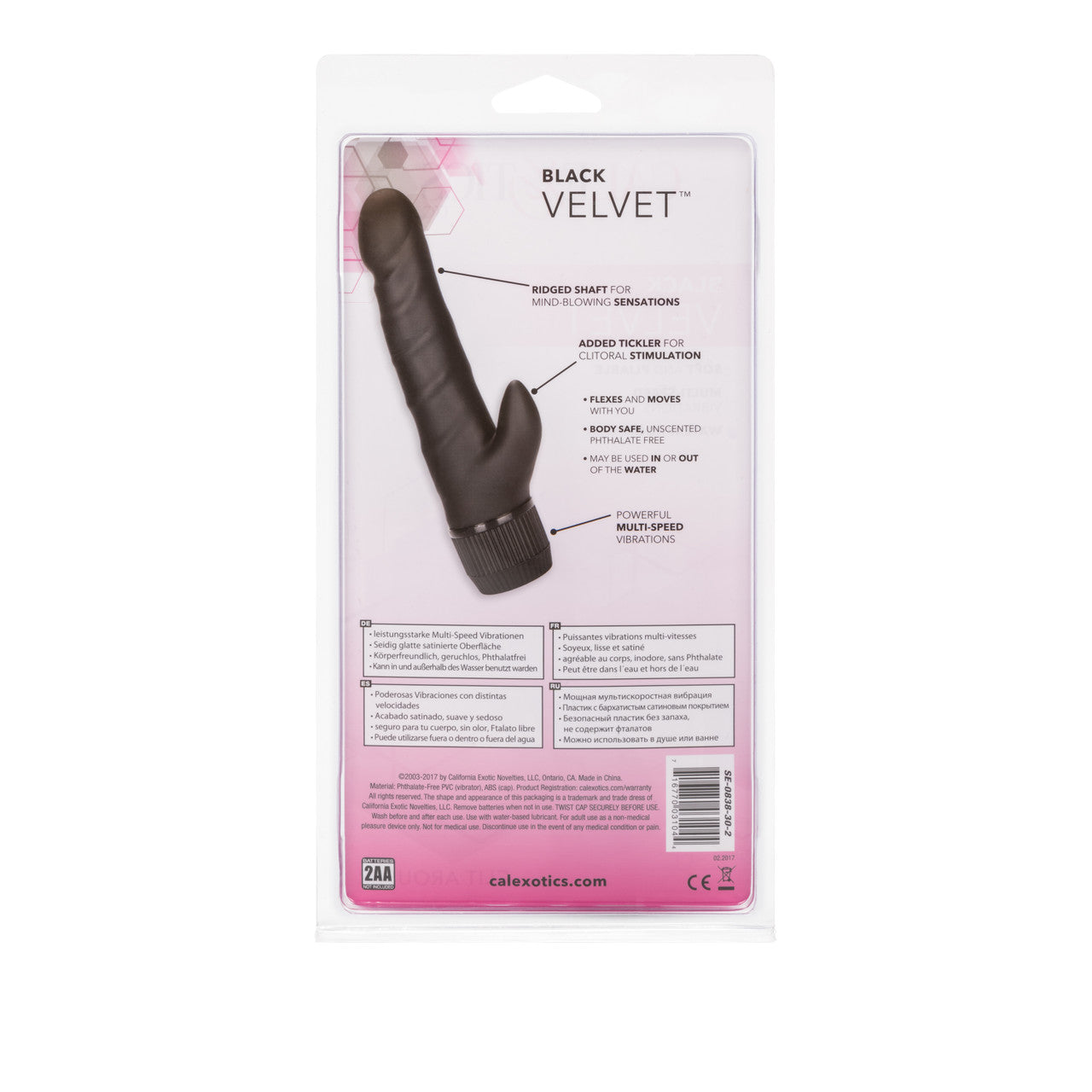 Black Velvet 5 inches Clitoral Stimulator Vibrator. The ultra smooth and powerful Black Velvet 5 inches Clit Stimulator is designed for ultimate solo sensual satisfaction. The sleek, power packed penis shaped combo stimulator delivers erotic sensations for an orgasmic experience every time. The discreet and velvety soft personal massager is perfect for the first time and experienced users. The sensuous Stimulator measures 5 inches by 1.25 inches and is made from ABS Plastic with Velvet Touch Polyurethane PU Cote. The velvety soft and smooth Penis Shaped Stimulator has a solid shaft with contoured pleasure ridges and a sensually smooth head. The shaft also features a curved clitoral teaser for simultaneous tantalizing pleasure. The easy to use vibrator runs on 2 AA batteries. The orgasmic experience is controlled via the easy twist durable Plastic End Cap that allows you to take full control of your climax intensity. The waterproof Stimulator is recommended for use with a quality personal lubricant and is great for intimate solo play in the shower, bath or hot tub. Before and after use, remember to clean the stimulator. Wash it in warm soapy water, or use a toy cleaner spray. Pat dry before storing. Black Velvet Clit Stimulator measures 5 inches long by 1.25 inches wide. Velvet Touch super soft material Clitoral Stimulating Vibrator is pliable and velvety soft. Totally waterproof and multiple speed. Totally waterproof and multiple speed Vibrator requires 2 AA batteries, not included. Vibrating sex toy is made using phthalate free, non-toxic materials Futurotic Thermoplastic Rubber TPR Shaft, Clitoral Stimulator, ABS Plastic Base. Do not leave batteries in the vibrator between uses. A water based personal lubricant is recommended. Black Velvet Massager is a registered trademark for California Exotic Novelties. Sex toys and sexual wellness. Colors may vary. Categories: Rabbit Style Vibrators, Dildos, Dongs, Realistic, Dildos and Dongs Realistic, Clitoral Stimulators. 2023.
