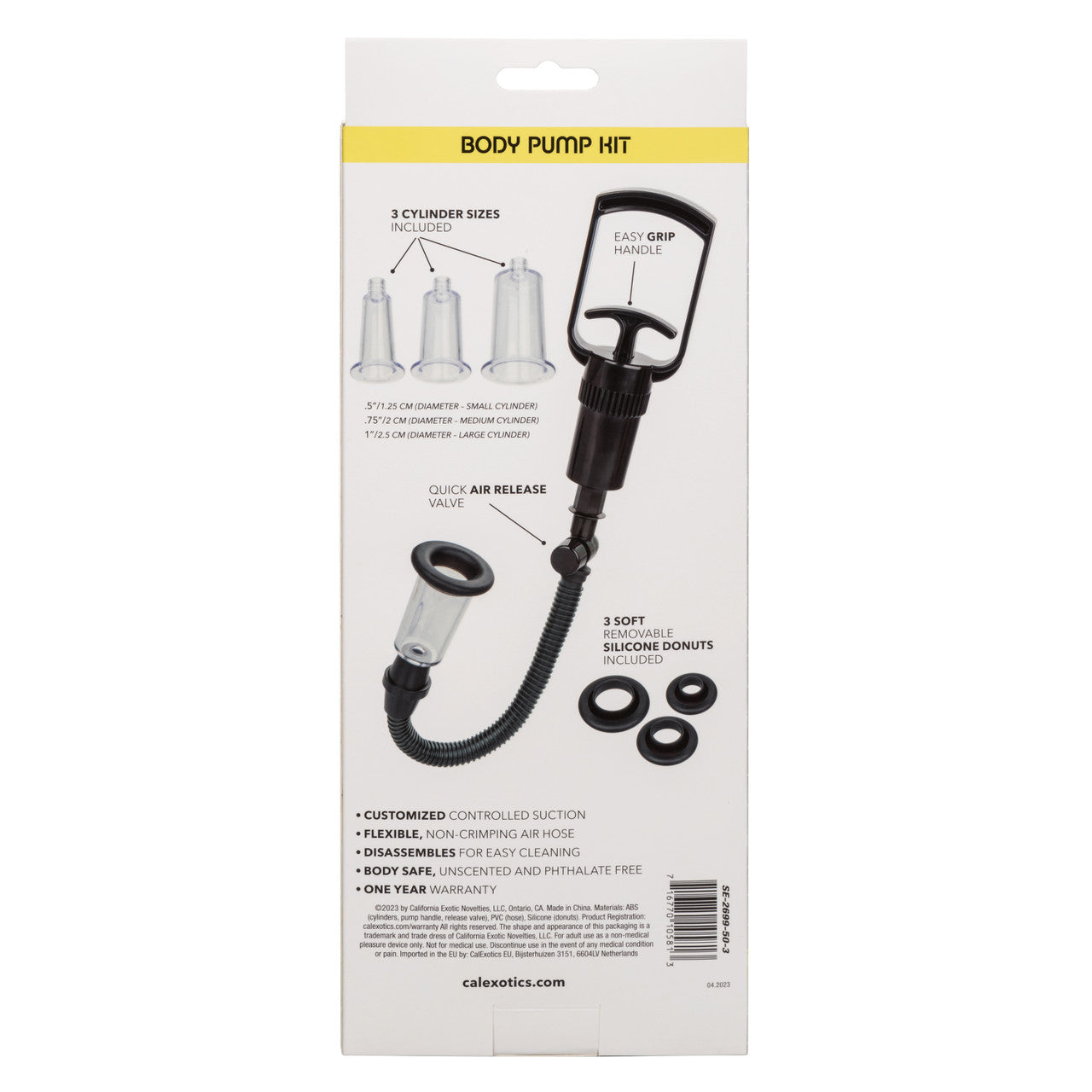 Features: Phthalate free Body safe materials. Materials type: ABS Plastic Cylinders, Pump Handle, Release Valve, PVC Hose, Silicone Donuts. Measurements: .5 inch diameter Small Cylinder. .75 inch diameter Medium Cylinder. 1 inch diameter Large Cylinder. Bulk weight 4.3 ounces. Package with Body Pump Kit 6.5 ounces. Package size 1.75 inches by 4.75 inches by 12 inches. Categories: Sex Toys for Men, Penis Pumps, Male Pumps, Trigger Pumps, Penis Enhancer Kits. 2023.