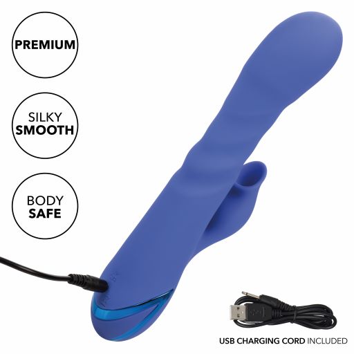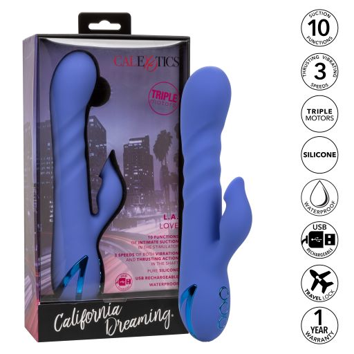 California Dreaming L.A. Love Rabbit Style Vibrator from California Exotic Novelties. The playful California Dreaming Collection brings luxurious fantasies to life with the orgasmic L.A. Love. The powerful massager is ready to relive your favorite summer fling fantasies with 10 functions of intimate suction paired with 3 speeds of independent vibration and thrusting action. The sensual shaft features 3 speeds of thrusting action and vibration to make sure you always hit the right spot. While the thrusting action and vibrations work their magic, the full coverage suction tip gives you knee shaking suction stimulation. The clitoral encaser has 10 functions of suction for wave after wave of orgasmic external stimulation. While the suction teases, the sensually shaped shaft and rounded tip deliver deep thrusting and vibrating stimulation. The knee shaking gyrations packed into this playful vibe are not for the faint of heart! Triple power motors put out deep thrusting, rumbling vibrations, and powerful suction. Plug the provided USB cable into the self sealing charging port to recharge your passion in 2.5 hours. Thrill with up to 90 minutes of intense pleasure. To effortlessly control stimulation, the sleek 3 button control pad lets you independently operate the different pleasure options. The high tech memory chip remembers just how you like it and resumes play on the last function used.