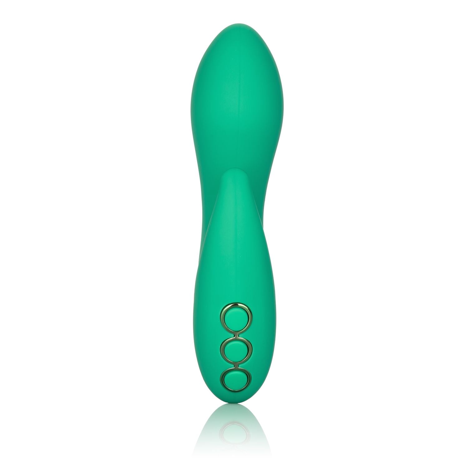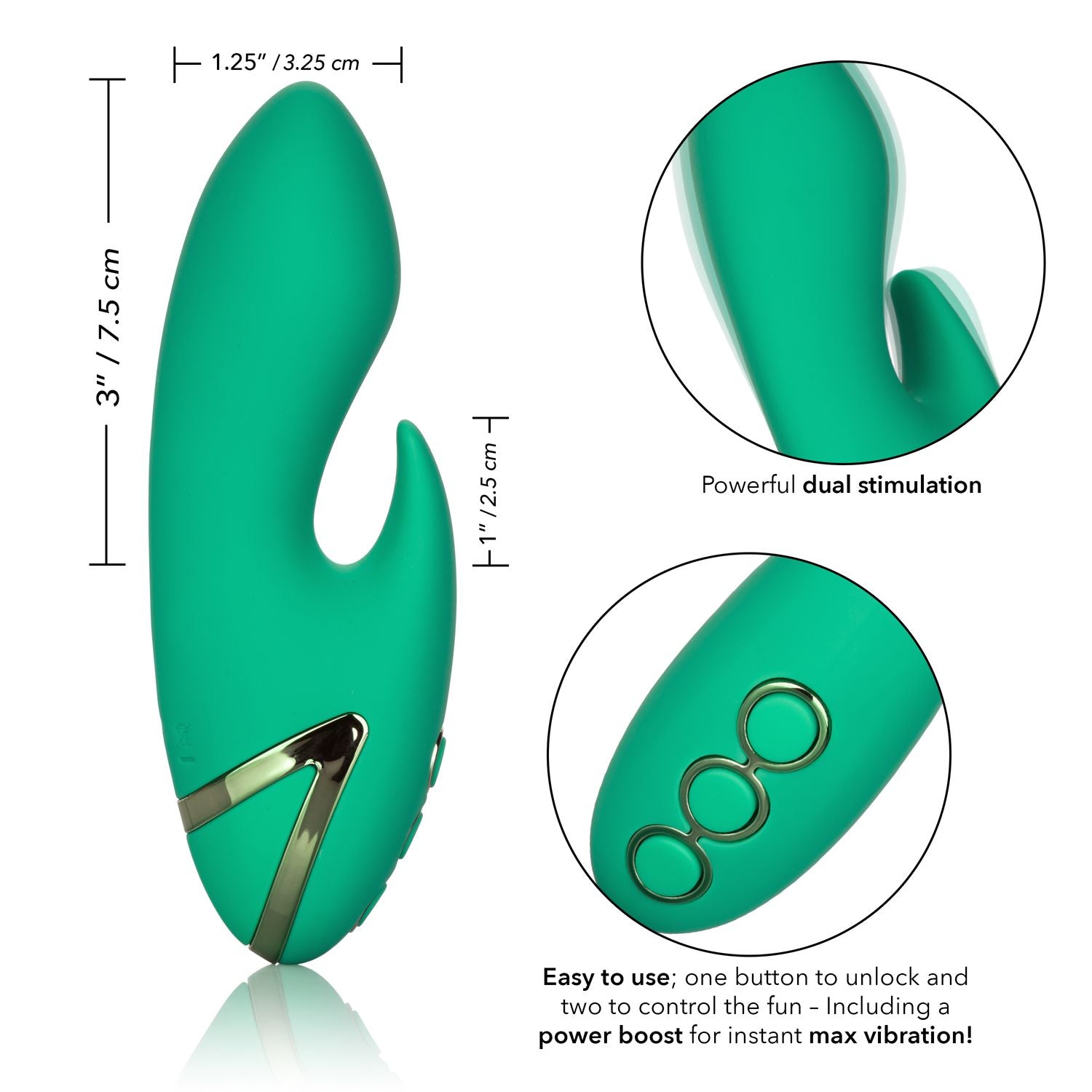 California Dreaming Sierra Sensation Rabbit Vibrator from Cal Exotics. Indulge in waves of pleasure as the California Dreaming Sierra Sensation moves you in all the right ways. The naughty travel size rabbit vibrator is ready for your next adventure with a flexible teaser, 10 sensational vibration functions and a thrilling Power Boost action.The sensually contoured teaser tip and curved shaft are superb for caressing internal and external pleasure points. For an ultra smooth surface, this curved shape vibe and teaser is covered in a premium Silicone with sleek profile buttons. Indulge personalized pleasure with the flexible massager body and 10 vivacious vibration, passionate pulsation and erotic escalation. Indulge in super charged pleasure with the Power Boost function for intense vibrations. The easy touch 2 button control lets you cycle through the knee shaking settings or use the secure travel lock feature to let your passion takes you. Recharge the premium silicone vibrator in 2.5 hours with the provided USB charging cable to enjoy 45 minutes of high speed stimulation or 90 minutes of low speed vibrations. While the easy touch button controls the intensity and the vibe gives you the stimulation you want, the pliable body holds any position you desire. The self sealing charging port and virtually seamless body let you get steamy with this waterproof vibe. The hypoallergenic premium Silicone is body safe, unscented and phthalate free to keep you most sensitive spots, happy and healthy.
