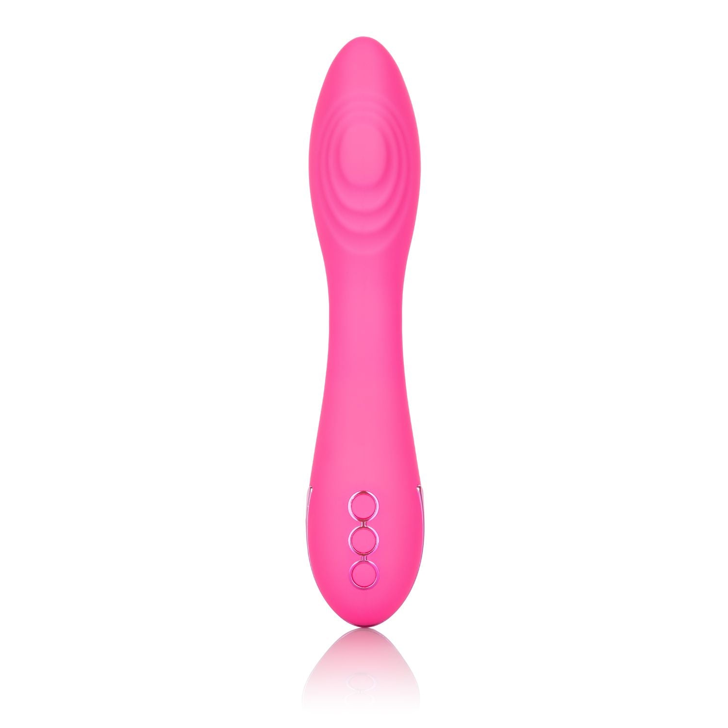California Dreaming Surf City Centerfold Pink Vibrator from California Exotic Novelties. Indulge in waves of pleasure as the California Dreaming Surf City Centerfold teases and tickles you towards ecstasy. The powerful wand massager has 3 thrilling thumping pulsation intensities and 10 functions of vibration for a once in a life time pleasure experience. The pulsating tip delivers thrilling speeds of thumping sensation that redefine pleasure. Choose the intensity of your pleasure with 3 thrilling thumping speeds and dive deep into passionate internal stimulation. To push you over the edge, the silky vibe has a knee shaking Power Boost function for instant maximum vibrations. The easy touch 2 button control lets you cycle through the knee shaking settings or use the secure travel lock feature to let your passion takes you. Recharge the premium Silicone vibrator in 2.5 hours with the provided USB charging cable to enjoy 45 minutes of high speed stimulation or 90 minutes of low speed vibrations. While the easy touch button controls the intensity and the vibe gives you the stimulation you want, the pliable body holds any position you desire. The self sealing charging port and virtually seamless body let you get steamy with this waterproof vibe. The hypoallergenic premium Silicone is body safe, unscented and phthalate free to keep you most sensitive spots, happy and healthy.