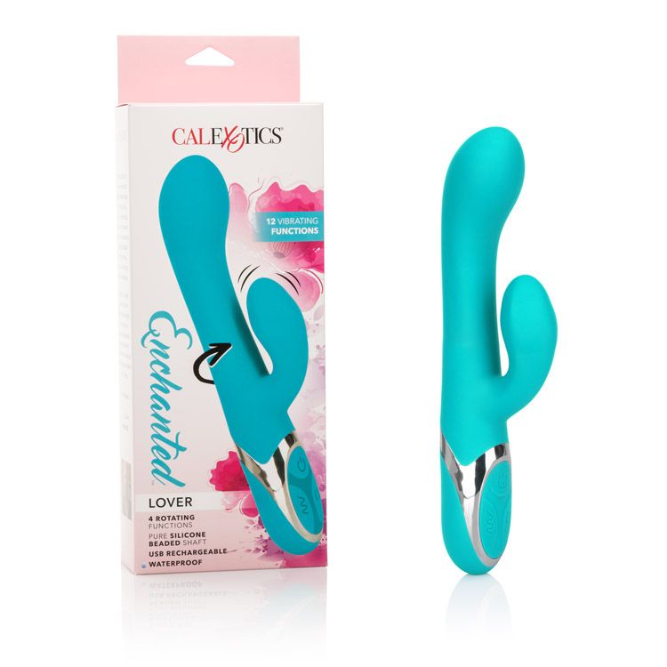 Enchanted Lover Rabbit Vibrator from California Exotic Novelties. Bring a little magic to your bedroom with the Enchanted Lover Vibrator. Transport yourself to a wonderland of pleasure with this vibrating massager's 4 rows of rotating pleasure beads, 4 functions of shaft rotation and 12 indulgent vibration functions. The gently curved tip and contoured clitoris massager flex and move with your body to deliver intense G-Spot and Clitoral stimulation. The seamless Silicone body and self healing charging port allow for powerful stimulation in and out of the water. Recharge the premium Silicone Vibrating Massager in 135 minutes with the provided USB charging cable to enjoy 65 minutes of high speed stimulation or 80 minutes of low speed vibrations. While the easy touch 3 button pad controls the intensity and the curvaceous vibe gives you the stimulation you want, the integrated state of the art memory chip remembers just how you like it by starting on the last function used. The hypoallergenic premium Silicone is body safe, unscented and phthalate free to keep you most sensitive spots, happy and healthy. Multiple rows of non-jamming pleasure beads. This item features a state of the art memory chip that will resume on the last function used. Reignite the pleasure, right where you left off. Designed for easy use, you will find operation a snap even on the darkest night. Frustration free and perfect for pleasure, just one push brings intense stimulation your way. Bulk weight 9.9 ounces. Materials: Silicone, ABS Plastic Metallic Plating. Functions a variable speed control takes you to the height of gratifying pleasure. You will find sensual stimulation that throbs with excitement. 12 functions bring you thrilling elements of vibration, pulsation, and escalation. Experience the ultimate bedroom adventure! Exciting rotating action means sensual pleasure. You will be stimulated and gratified in no time at all.1 year warranty. Battery information this product includes USB charging capabilities. Measurements 5 inches by 1.5 inches shaft. 2.25 inches by 1.25 inches stimulator. Categories: Rabbit Style Vibrators, Eco-Friendly Sex Toys, Rechargeable Vibrators, Sex Toys for Women, G-Spot Rabbit Style Vibrator. 2023.