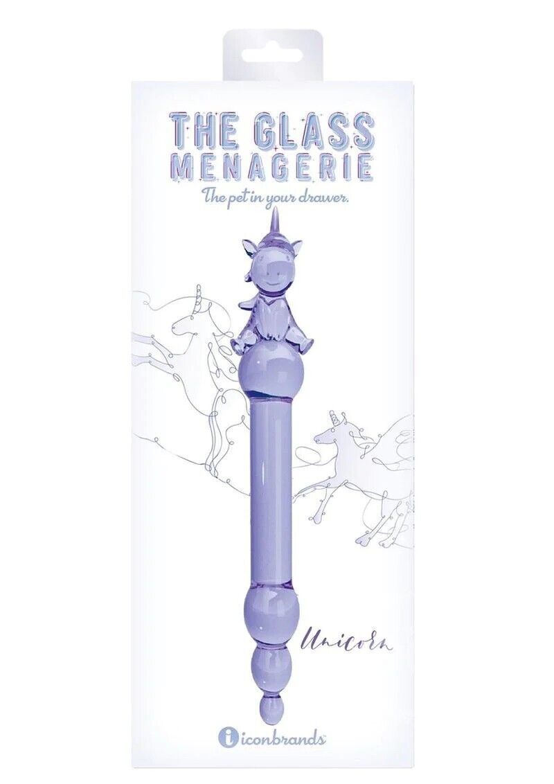 Glass Menagerie Unicorn Dildo Purple from Icon Brands. Charming full sized Glass Dildos with a cute little Unicorn on top. What could be better than the smooth, sensuous feel of crystal clean Glass against your most erogenous curves? How about your very own pet for petting: a Glass bedside Wand with your favorite little guy on top! Icon brings you all the shapes and sizes, nubs and swirls that make glass so pleasurable, but with an added little lover watching down on you. Think of it as creature comfort or animal instinct.