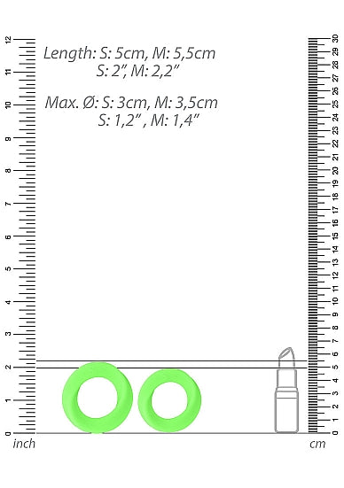 Ouch! Glow 2 Piece Cock Ring Set Glow In The Dark from Shots Toys. Ouch! Glow in the Dark, the future of bondage is here. Designed with an authentic bondage, fetish aesthetic, but with the added delight of the glow in the dark properties, the fluorescent green detailing will turn every event into a part. With Ouch! Glow in the Dark, the fun is just beginning when the lights go out. This cock ring set contains two sized rings that are comfortable and stretchy. The rings will improve your sexual performance and bring you tons of possibilities because of its flexibility. Please note Ouch! Glow In The Dark products must be activated with the sunlight before enjoying it in the dark.