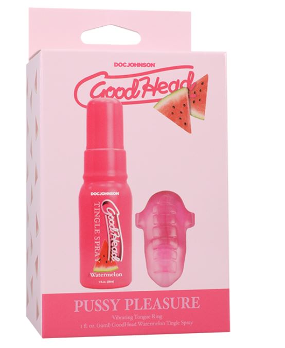 Give your partner an experience they'll never forget! This Pussy Pleasure Party Kit gives you that little extra boost to make going down special. The Vibrating Ring fits right around your tongue and has a textured surface for extra stimulation, and the plush pink TPE flexes with the movement of your tongue. Use the Watermelon Tingle Spray together with the ring to add great flavor to an already incredible experience.
