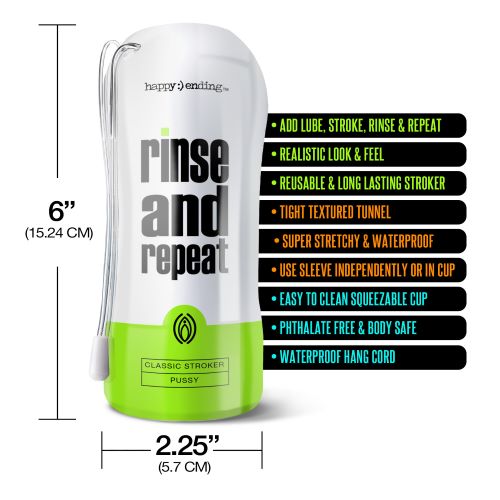 Happy Ending :) Rinse and Repeat Classic Stroker Pussy from Global Novelties. Add lube, stroke, rinse and repeat. Realistic look and feel that is reusable and a long lasting stroker. A tight textured tunnel that is super stretchy and waterproof. Use sleeve independently or in a cup. Easy to use and easy to clean. Body safe and phthalate free. The 3 styles include: Pussy, Ass and Mouth. Each sold separately. Categories: Male Masturbators, Masturbators, Pussy, Masturbation Sleeves. 2023.