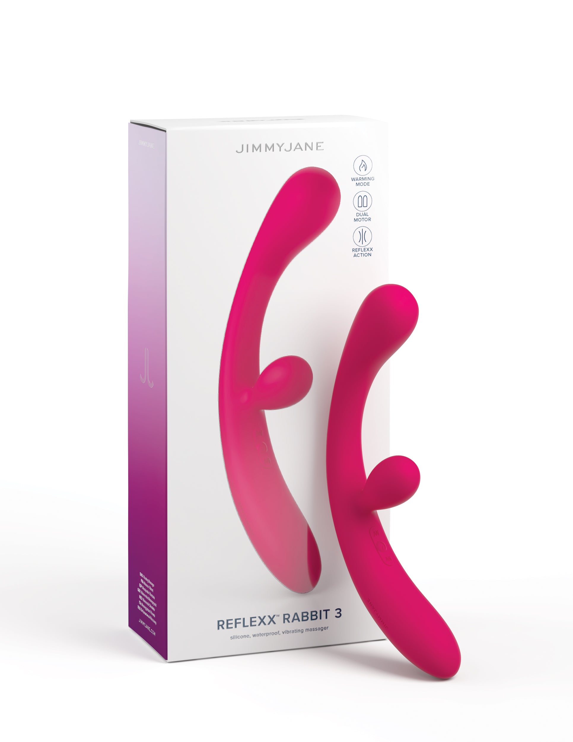 JimmyJane Reflexx Rabbit Vibrator 3 from Pipedream Products. Looking for the type of vibrator that just feels right? You know, the one that makes you wonder how you ever lived without it before? That is the Reflexx Rabbit 3, whose curved design is primed for heavenly pleasure. Enjoy sensational G-Spot and Clitoral stimulation as you have never quite felt it. To take it to the next level, you can make use of the vibrator's dual, independently controlled motors to personalize your pleasure. Each motor features ten high performing vibration modes you can try out to find the one that suits your mood. The only problem? You may not ever want to leave the bedroom again. That is not all, though. The Reflexx Rabbit 3 also comes with a handy warming mode. This new trend in vibrator technology allows your vibrator to heat up to just above body temperature in only a few minutes. No need to deal with the unpleasant sensation of trying to use cold toys on your most sensitive areas anymore. The warming mode also helps your body relax. If you are prone to feeling tense in your pelvic area, this mode is simply something you can not miss. The warm temperature helps to increase blood flow in the area, easing tension and paving the way for stress free pleasure. This is all especially useful if you have trouble relaxing during intercourse. Using the Reflexx Rabbit 3 during foreplay can help you prep for a more comfortable and enjoyable sexual experience. The best news of all? The Reflexx Rabbit 3 is designed with super soft and flexible phthalate free, latex free Silicone. It is the perfect blend of comfort and safety, two factors that are absolutely essential for a vibrator. You also do not have to concern yourself with buying and replacing batteries either this vibrator is rechargeable. Dual independently controlled motors allow you to personalize your pleasure. The curved design simulates the G-Spot and Clitoris simultaneously. Warming mode brings the vibrator just above body temperature in a few minutes. Each vibrating motor features ten high performing vibration modes for your every mood. Designed with super soft and flexible phthalate free, latex free Silicone.