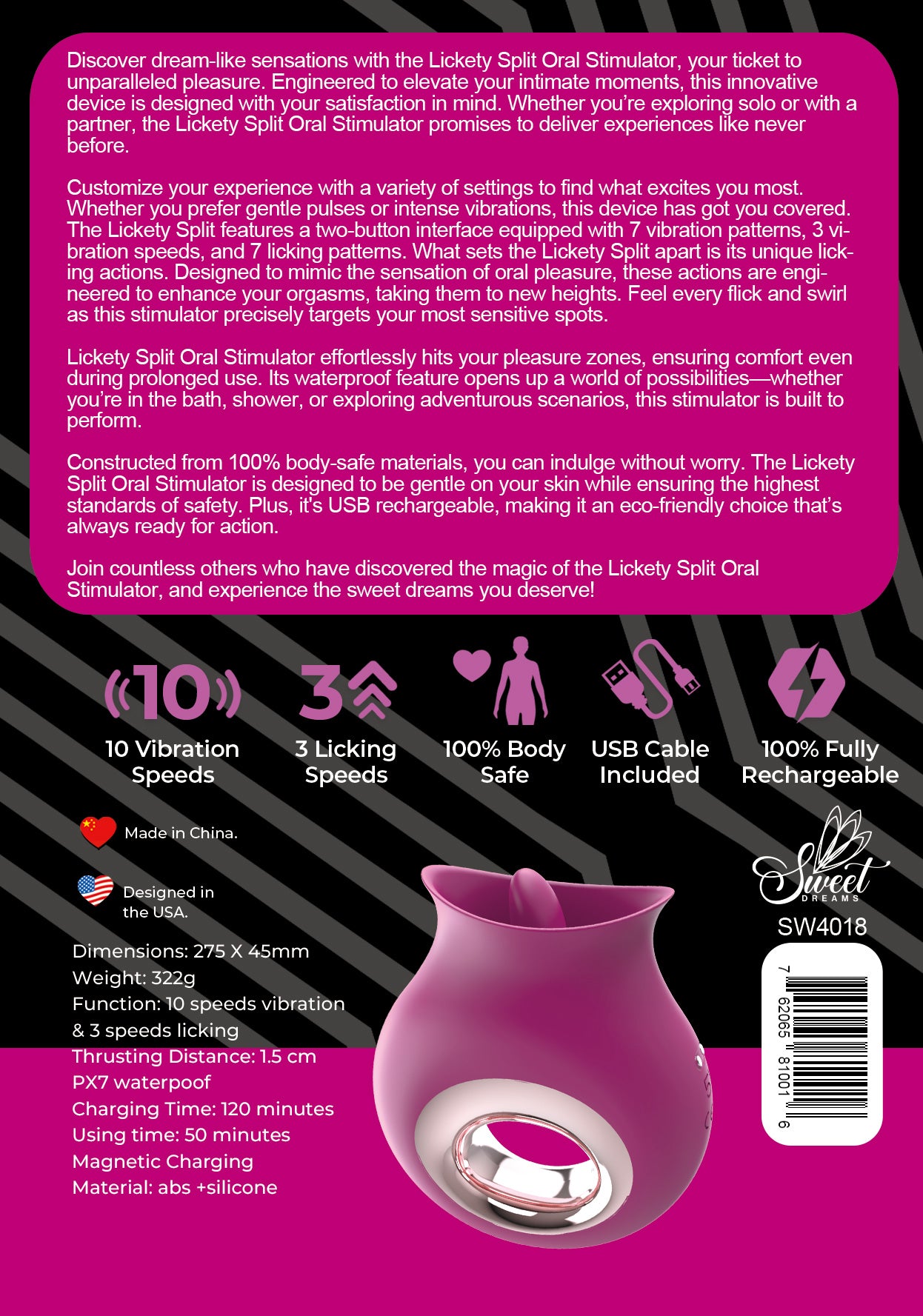 Lickety Split Oral Stimulator effortlessly hits your pleasure zones, ensuring comfort even during prolonged use. Its waterproof feature opens up a world of possibilities—whether you’re in the bath, shower, or exploring adventurous scenarios, this stimulator is built to perform.