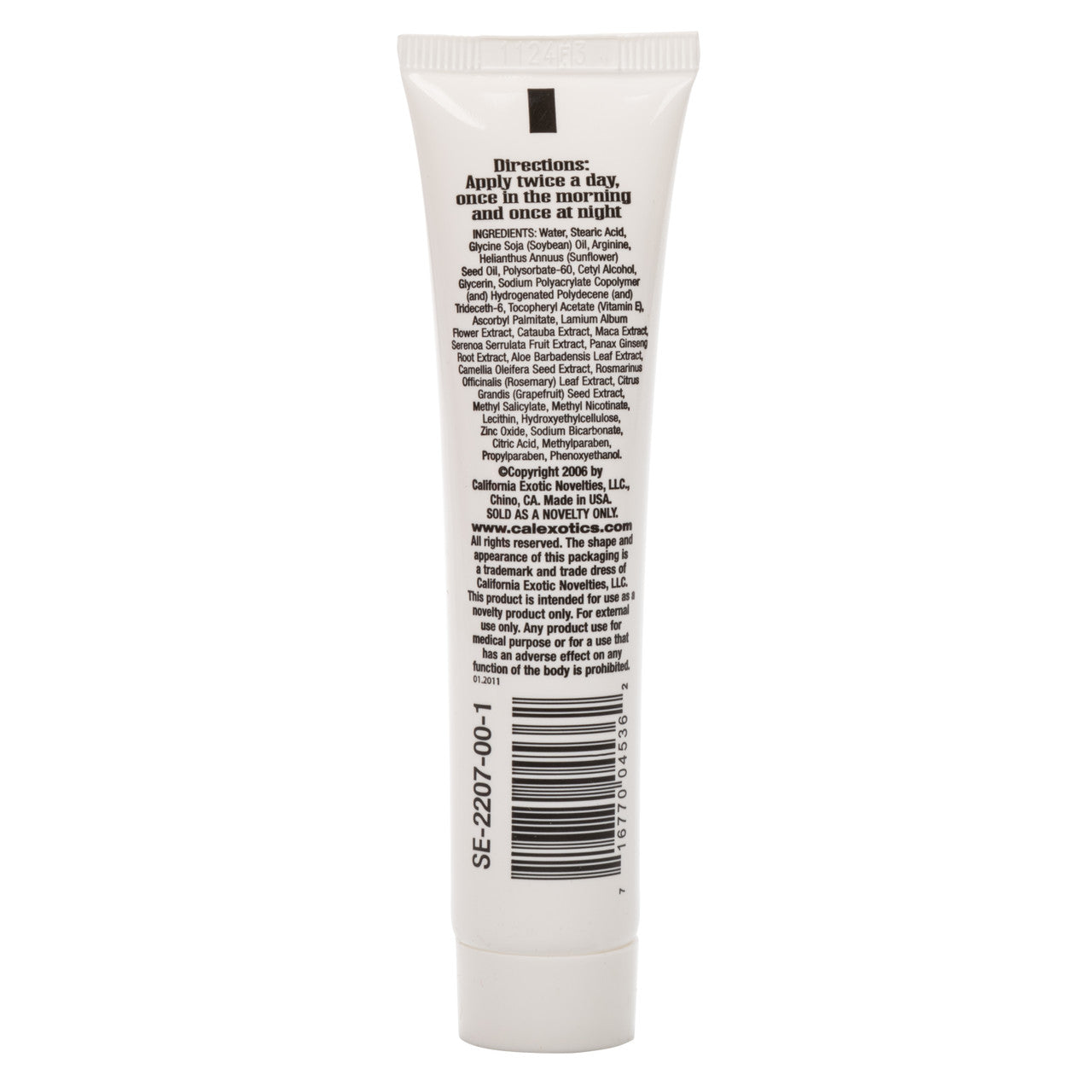 Maximus Enlargement Cream from California Exotic Novelties. Super size your intimate pleasure with the Maximus Enlargement Cream. The smooth greaseless cream is designed to help increase circulation and improve sensation and fullness, for the ultimate explosive climax experience. The unscented homeopathic formula cream delivers maximum strength benefits to achieve a stronger rock hard erection that is always ready for prolonged intimacy. The sensual cream enhances and enlarges the penis so that you can enjoy a peak performance throughout foreplay and intercourse. The homeopathic formula contains a blend of ingredients that include natural herbal erection enhancers. Apply the odorless cream directly onto the penis, with fingertip application to ensure even coverage. Once the effects of the cream kick in you can indulge in unlimited hard and fast love action. For maximum benefits apply the cream twice daily, before every erotic encounter. Increase size, elevate your playtime experience and boost your confidence with this cream. The slick cream is supplied in a handy portable, travel sized tube for direct application and easy use. If size matters, use the enhancer cream to improve stamina and sensual performance during vaginal intercourse and anal penetration. Apply a thin layer of the cream directly onto the penis and prepare to enjoy the ride of your life. The cream is suitable for first time and experienced users, and can be used for sensual lover seduction, or for experimental self gratification play. Size matters! New homeopathic formula to enhance and enlarge. For maximum results use twice daily. Ingredients: Water, Stearic Acid, Glycine Soja Soybean Oil, L-Arginine, Helianthus Annus Sunflower Seed Oil, Polysorbate 60, Cetyl Alcohol, Glycerin, Sodium Polycrylate Copolymer, Hydrogenated Polydecene, Trideceth 6, Tocopheryl Acetate Vitamin E, Ascorbyl Palmitate, Lamium Album Flower Wxtract, Catauba Extract, Maca Extract, Serenoa Serrulata Fruit Extract, Panax Ginseng Root Extract, Aloe Barbadensis Leaf Extract, Camellia Oleifera Seed Extract, Rosnarinum Officinalis Rosemary Leaf Extract, Citric Grandis Grapefruit Seed Extract, Methyl Salicylate, Methyl Nicotinate, Lecithin, Hydroxyethyl Cellulose, Zinc Oxide, Sodium Bicarbonate, Citric Acid, Methylparben, Propylparaben, Phenoxyethanol. Maximus Enlargement Cream is a registered trademark for California Exotic Novelties. Sex toys and sexual wellness. Made in the USA. Categories: Erotic Body Lotions, Enhancement Creams, Masturbation Creams and Lotions. 2024