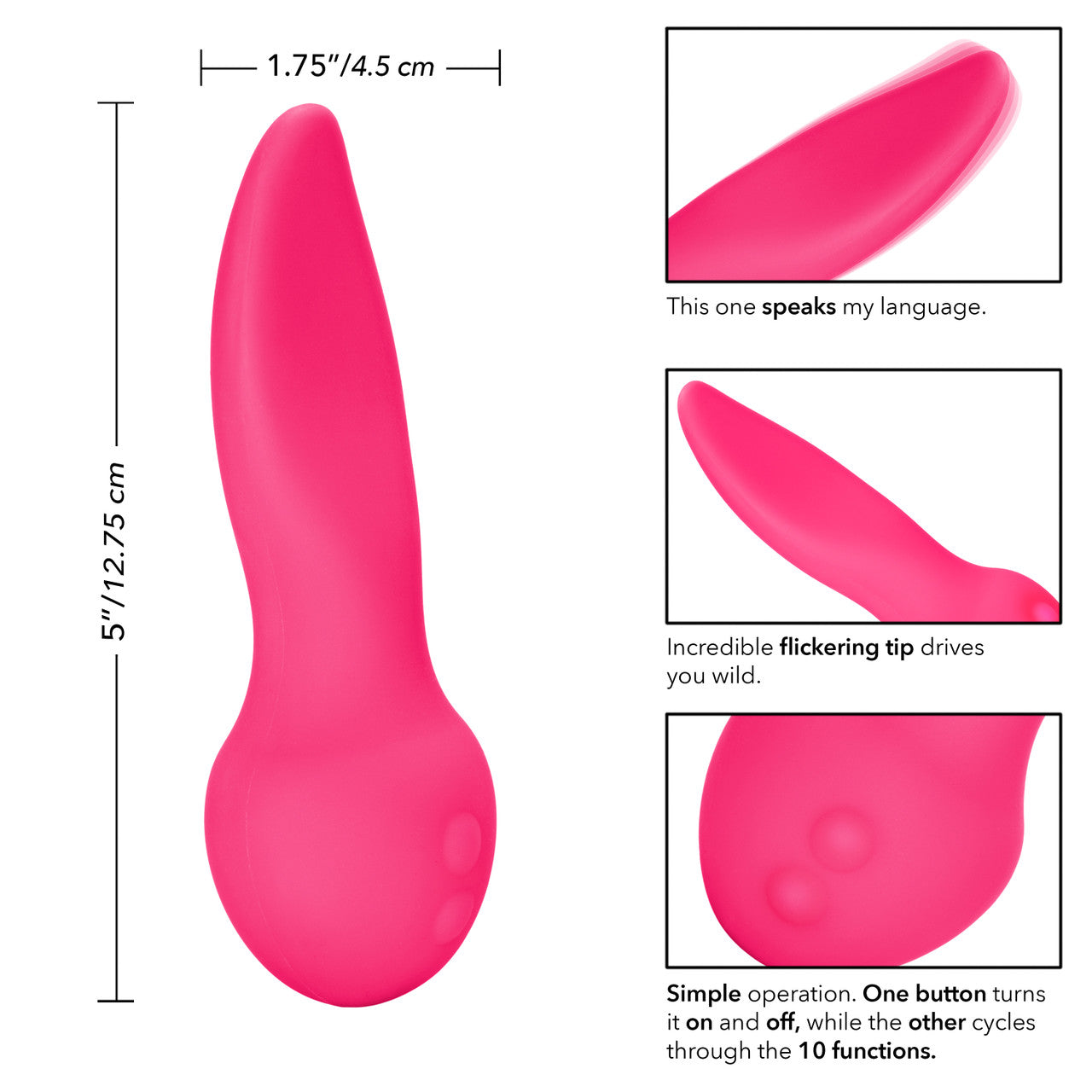 Mini Marvels Silicone Marvelous Flicker Pink Tongue Vibrator from California Exotic Novelties. This one really speaks my language! Tantalize and tease your most intimate sweet spots with the Mini Marvels Marvelous Flicker. The rechargeable, tongue shaped mini vibrator is designed for discreet pinpoint stimulation, and orgasmic enjoyment whenever you are in the mood for intimate fun. The erotic massager measures a compact 5 inches by 1.75 inches and is made from super soft and ultra smooth, phthalate free, unscented premium Silicone. The uniquely contoured, tongue shaped personal massager boasts 10 powerful vibration, pulsation and escalation functions for mind blowing satisfaction. The sleek massager has a sensuous precision tip and flickering action, for intensified ecstasy. The discreet vibrator easily slips inside your purse for sensual seduction on the move. Indulge in 10 tantalizing functions and completely recharge the stimulator in 2.5 hours. Before and after play, clean the vibe with mild soapy water or a toy cleaner spray. Easy to operate, rechargeable Silicone massager with flickering tip for intense pinpoint action. 10 functions of intense vibration, pulsation and escalation. Security travel lock. Hold for 3 seconds to turn on or off. USB rechargeable. Charging cord included. Complete charge in 2.5 hours. Runs for 40 minutes on high speed and 4 hours on low speed. Waterproof for play in and out of the water. One year warranty. Materials Silicone. Bulk weight 2.9 ounces. 5 inches by 1.75 inches. Categories: Vibrators, Clitoral Stimulators, Eco-Friendly Sex Toys, Rechargeable Vibrators, Tongue Vibrators, Oral Products, Sex Toys for Women. 2023.