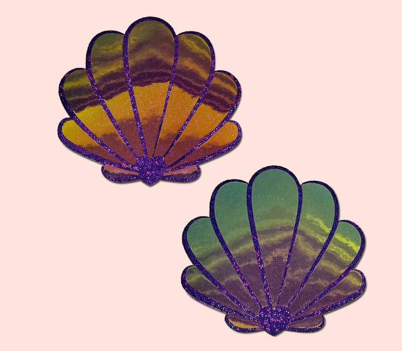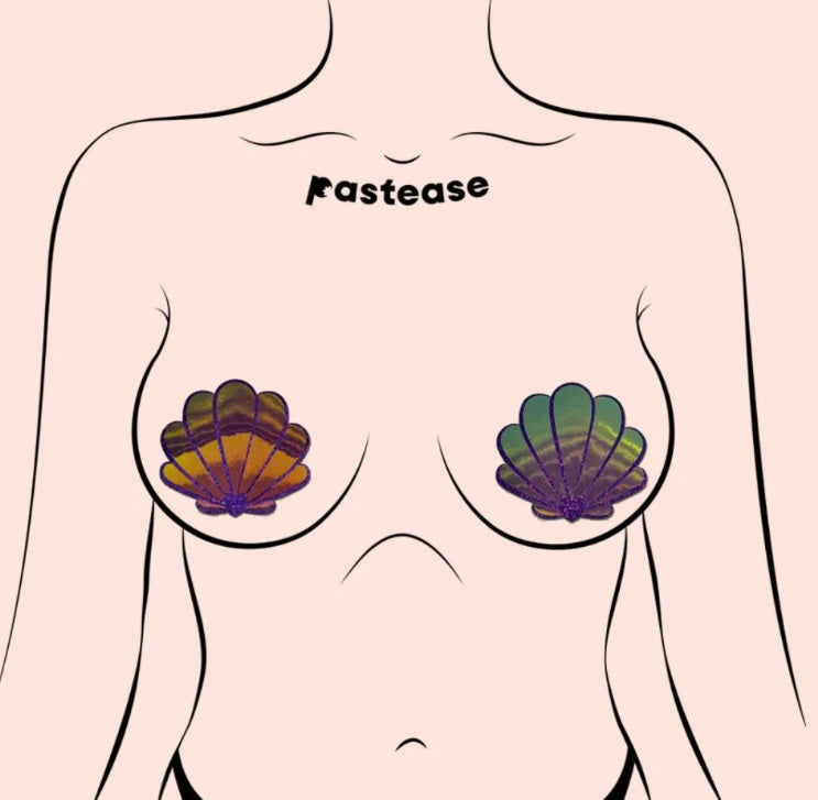 Introducing our Mermaid Shells Pasties in Opalescent Purple & Gold Seashell by Pastease® – the ultimate accessory for beach lovers and mermaid enthusiasts alike! Crafted from a luxurious blend of glitter purple with a stunning opalescent gold and seafood green film overlay, these pasties bring a touch of whimsical charm to your summer wardrobe.