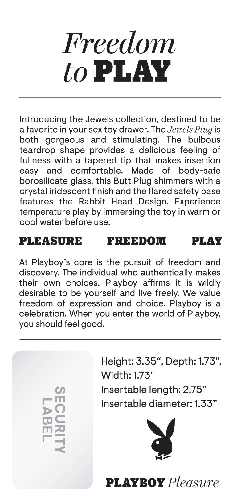 Playboy Jewels Glass Butt Plug from Evolved Novelties.Introducing the Jewels collection, destined to be a favorite in your sex toy drawer. The Jewels Plug is both gorgeous and stimulating. The bulbous teardrop shape provides a delicious feeling of fullness with a tapered tip that makes insertion easy and comfortable. Made of body safe Borosilicate Glass, this Butt Plug shimmers with a crystal iridescent finish and the flared safety base features the Rabbit Head Design. Experience temperature play by immersing the toy in warm or cool water before use. Panel details: Play with me key feature shatter resistant Glass, tapered Butt Plug. Non-vibrating Butt Plug. Material: Borosilicate Glass. Waterproof, submersible. 5 years warranty. Size specifications height 3.35 inches, depth 1.73 inches, width 1.73 inches. Insertable length 2.75 inches, diameter 1.33 inches. Categories: Anal Toys, Small, Medium Butt Plugs. 2024.