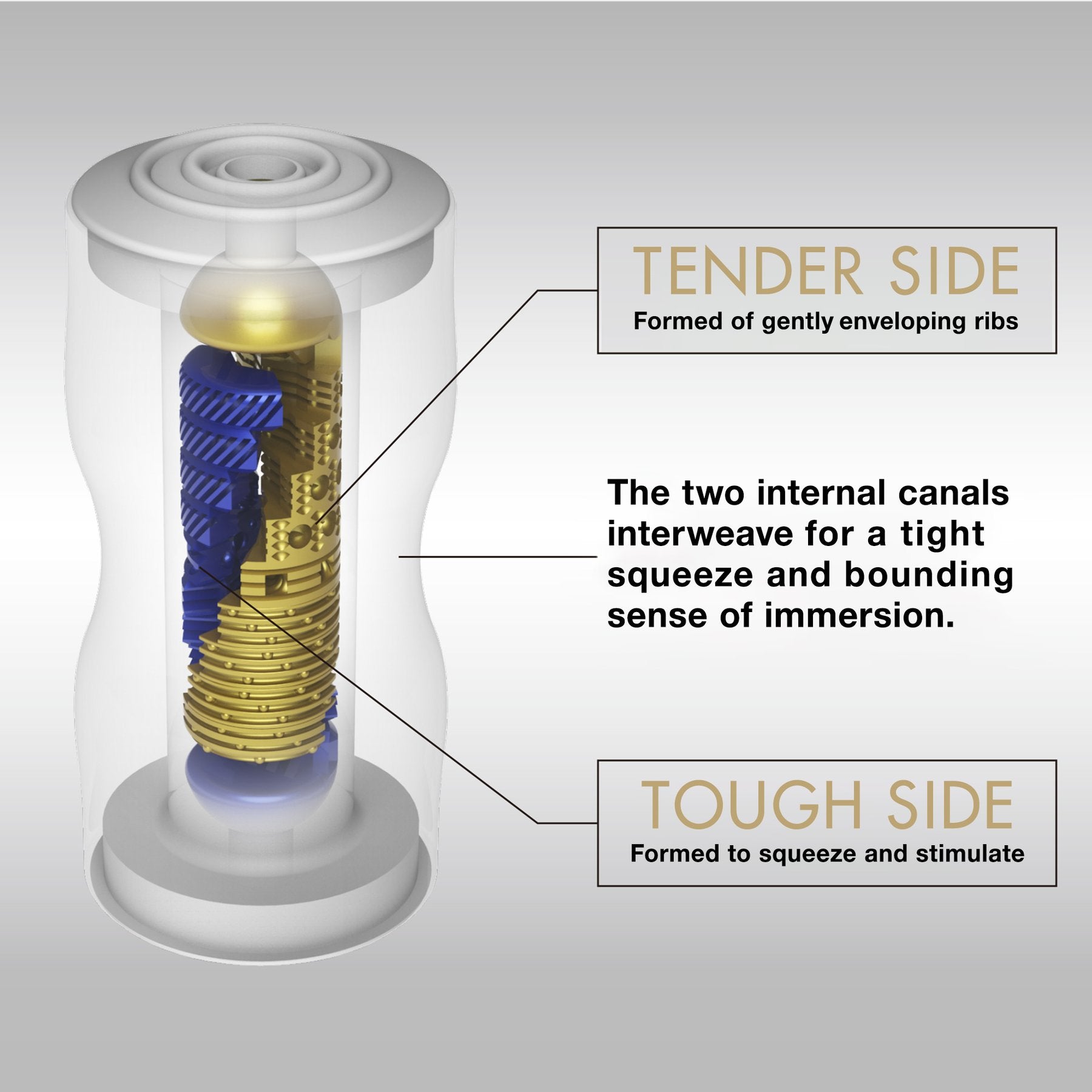 Premium Dual Sensation Cup Stroker from Tenga Master's Craft Edition. Premium Dual Sensation Cup is a masturbator with two holes one on each end for stimulation. A tender side and a tough side. Tender side formed with gently enveloping ribs. Tough side formed to squeeze and stimulate. The two internal canals interweave for a tight squeeze and bounding sense of immersion. The new models marked as Premium differ from their predecessors by more complicated insets inside, which provides even more pleasant stimulation. The Tenga Premium Dual Sensation Cup masturbator is a product that will provide you with the highest quality experience. A network of stimulating tabs inside the sleeve. Intense sensations. Internal pressure control. Easy to maintain hygiene. Two holes for stimulation.