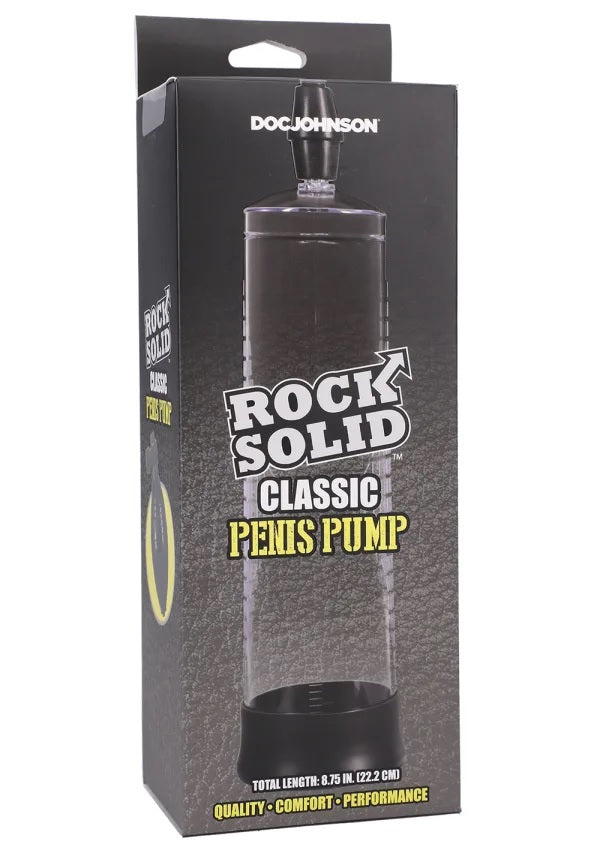Get ready for larger, thicker erections with Rock Solid's Classic Penis Pump from Doc Johnson. This clear tube allows you to see your growth with each squeeze of the bulb. Its silicone entry sleeve keeps the pressure in, and its easy-release button gives you the ability to move on to your next endeavor.