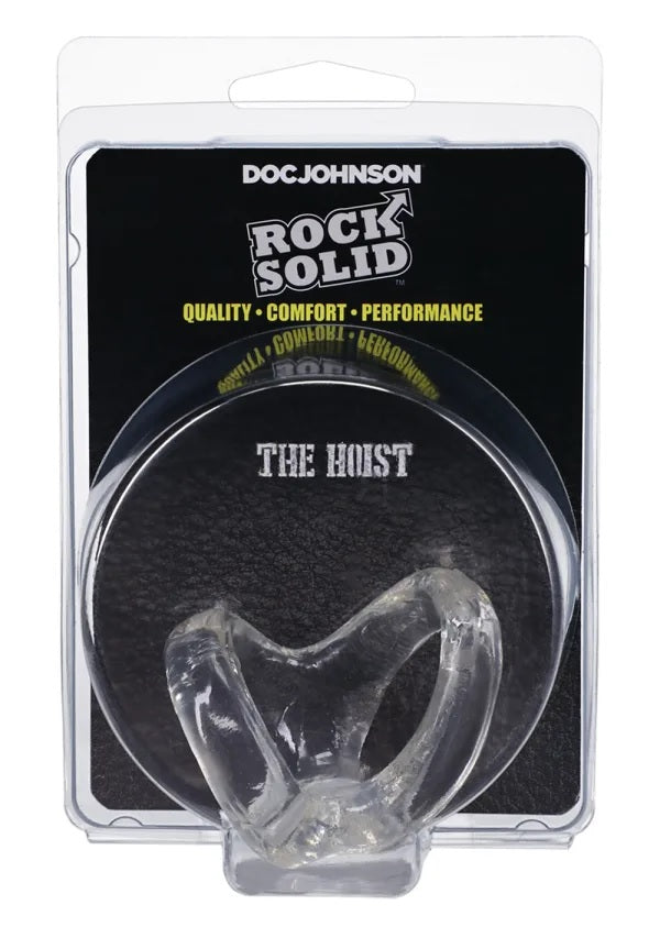 The Hoist is a dual cock ring with additional support for your balls. Designed for a comfortable, snug fit that helps maintain extra hard erections and maximize your performance. This TPE material allows for a light stretch to get it placed right. Rock Solid cock rings enhance size and thickness for longer, harder erections, and are completely body-safe.