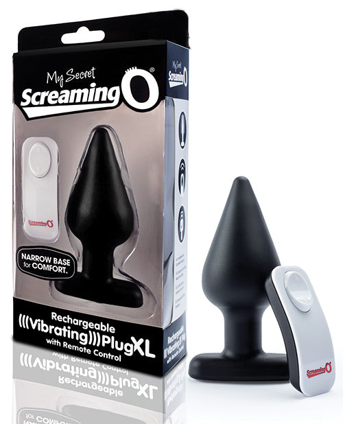 Screaming O My Secret Plug XL Black. Enjoy fun and flirty back door play no matter where you are with the Screaming O My Secret Charged Plug XL the remote controlled, rechargeable vibrating plug, now in a new, larger size. My Secret Charged Plug XL lasts over 60 minutes on a single charge, and comes with a compact remote that works up to 40 feet away. My Secret Charged Plug XL can be used with a partner to engage in stimulating sport together, or solo for quality time that is all about you. My Secret Charged Plug XL features a Powerful Positive motor that lets you toggle back and forth through 20 functions of deep, rumbling vibration, both steady and rhythmic. My Secret Charged Plug XL is waterproof, and made from lab tested, body safe True Silicone that is comfortable, flexible and compatible with all water based lubricants. My Secret Charged Plug XL now comes with a tapered, narrow base so you stay comfortable throughout play, and is backed by a limited 2 year warranty. Remote control works from up to 40 feet away. Insertion length 4 inches, diameter at widest point 1.125 inches. Base 2 inches.