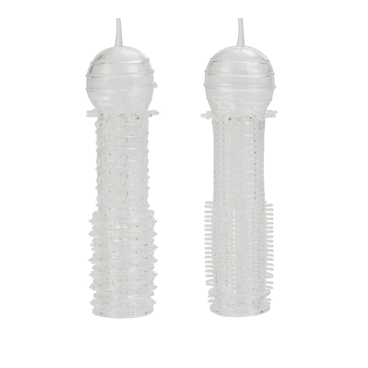 Senso Sleeves 2 Pack Clear. Play out your erotic fantasies with the super stretchy, transparent Senso Sleeves. The pair of textured phallus enhancers is designed for intimate exploration of the exotic and erotic kind. The easy to use ribbed and noduled sleeves comfortably fit over the phallus for elevated stimulation pleasure that is always mutually enjoyed. The Senso Sleeves are made from smooth, soft and unscented, hygienically superior phthalate free Senso Thermoplastic Rubber TPR. The ultra stretchy stimulation enhancers feature pleasure nodules, flexible teasers and ticklers, and a ribbed bulbous tip for unlimited sensual seduction and ecstasy. Choose your preferred textured design, and slide the sleeve directly onto the erect phallus for instant sensuous pleasure. Maximize the tantalization and sensitive sensations byusing a water based lube with these versatile toys. The textured Senso Sleeves are perfect for beginners, and ideal for an exotic toy collection. Use your imagination, and extend your seduction play with the stimulation duo. Explore your wildest dreams and red hot fantasies by indulging in your desires and elevating your personal pleasure. Spice up the intimate fun by alternating between the seductive textures and arousing teasers. Each transparent sleeve is made for sheer pleasure. Before and after every use, clean the comfort fit sleeves with a toy cleaner spray or wash in warm, soapy water. Senso Sleeves 2 Pack Clear set for both of you. 2 pack of super stretchy Senso Sleeves for enhanced sensual stimulation. Hygienically superior clear colored masturbators. Safe and pure for body and pleasure. Made using phthalate free, non-toxic materials Thermoplastic Rubber TPR. Sleeve measures 5 inches long by 1.2 inches wide. Always clean before and after use. Senso Sleeves is a register trademark for California Exotic Novelties. Sex toys and sexual wellness. Categories: Vibrator Sleeves, Penis Enhancer Kits, Male Extensions, Penis Sleeves, French Ticklers. 2023.