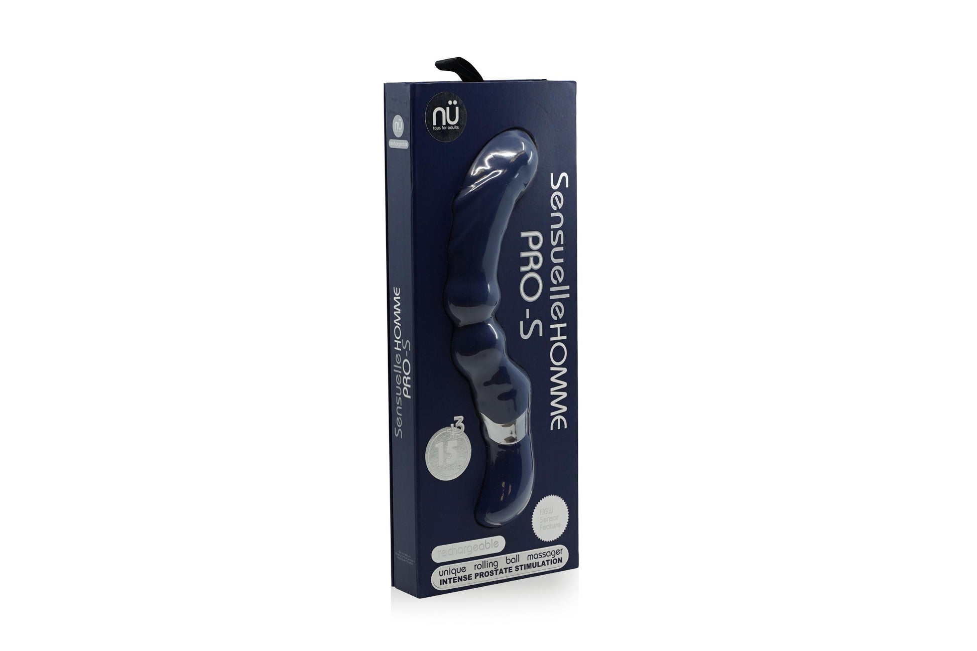 Sensuelle Homme Pro-S Prostate Massager Navy Blue for men. Thanks to its pleasure producing sensitivity, the prostate or P-Spot is often thought of as the male G-Spot. However, the truth is, the whole area feels amazing when properly stimulated. That is why we developed the Homme Pro-S. Just like our Homme Pro, the Pro-S is designed to be held rather than simply inserted hands free. This keeps you in total control of the position and pressure, giving you the ability to customize your experience. But we took it a step further and added touch sensitivity, our unique technology that automatically adjusts the intensity as you insert the anal sex toy. This feature means you will feel the mind blowing power increase to match your movement, no matter which of the 15 patterns you select. Once you have reached your destination, get ready for an extra tactile experience: a rolling ball massager just below the surface of the tip. This directly stimulates the prostate at any of the 3 available speeds. Just like the Homme Pro, the Homme Pro-S uses our specially designed motor to deliver powerful stimulation uniformly across the entire surface of the toy, providing incredible anal stimulation. And of course, Homme Pro-S is rechargeable, water resistant for easy clean up.