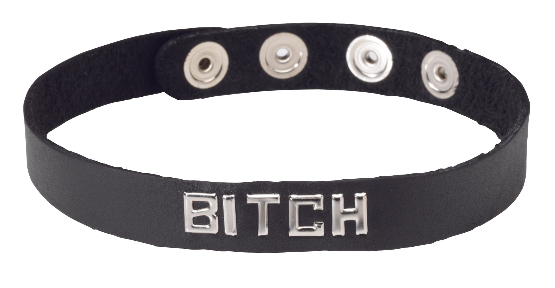 Spartacus Leathers Bondage Gear Wordband Collars Bitch Collar is an intimate, visually erotic accessory. Spartacus word band collars are handmade by skilled craftsmen using quality oil tan leather. Snap setting for 13 inches, 14 inches, 15 inches and 16 inches. Spartacus collars are handmade by skilled USA craftsmen using quality oil tan leather. Narrow band with four adjustable metal snaps. Nothing arouses the senses like leather. The Word Master is also in silver. Fulfill your strongest desires! Make a statement without saying a word with this sassy leather collar. The comfortably slender band comes with four adjustment snaps to ensure a snug fit, and features a sassy saying in silver-tone letter studs along the front. Perfect for a night at the club or a hot and heavy BDSM scene in the bedroom, this naughty collar will ensure all eyes are on you! Color Black. Material Leather. Word Collar Reads Bitch. Closure Snaps. Special Feature Adjustable snap setting for 13 inches - 16 inches. Fetish wear. Naughty role playing gear. Spartacus Leathers A Passion for Quality Catalog page 48. Milwaukie, Oregon. Made in the USA.