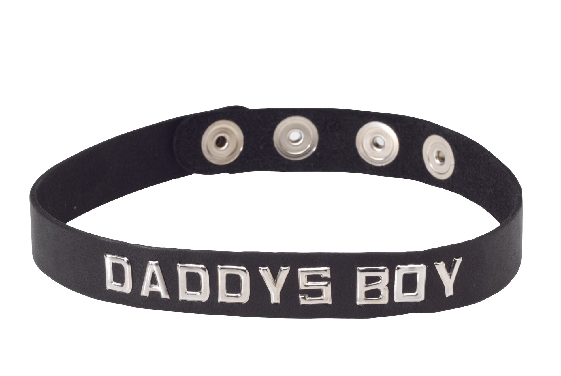 Spartacus Leathers Bondage Gear Wordband Collars Daddys Boy Collar is an intimate, visually erotic accessory. Spartacus word band collars are handmade by skilled craftsmen using quality oil tan leather. Snap setting for 13 inches, 14 inches, 15 inches and 16 inches. Spartacus collars are handmade by skilled USA craftsmen using quality oil tan leather. Narrow band with four adjustable metal snaps. Nothing arouses the senses like leather. The Word Master is also in silver. Fulfill your strongest desires! Make a statement without saying a word with this sassy leather collar. The comfortably slender band comes with four adjustment snaps to ensure a snug fit, and features a sassy saying in silver-tone letter studs along the front. Perfect for a night at the club or a hot and heavy BDSM scene in the bedroom, this naughty collar will ensure all eyes are on you! Color Black. Material Leather. Word Collar Reads Daddy's Boy. Closure Snaps. Special Feature Adjustable snap setting for 13 inches to 16 inches. Fetish wear. Naughty role playing gear. Spartacus Leathers A Passion for Quality Catalog. Milwaukie, Oregon. Made in the USA.