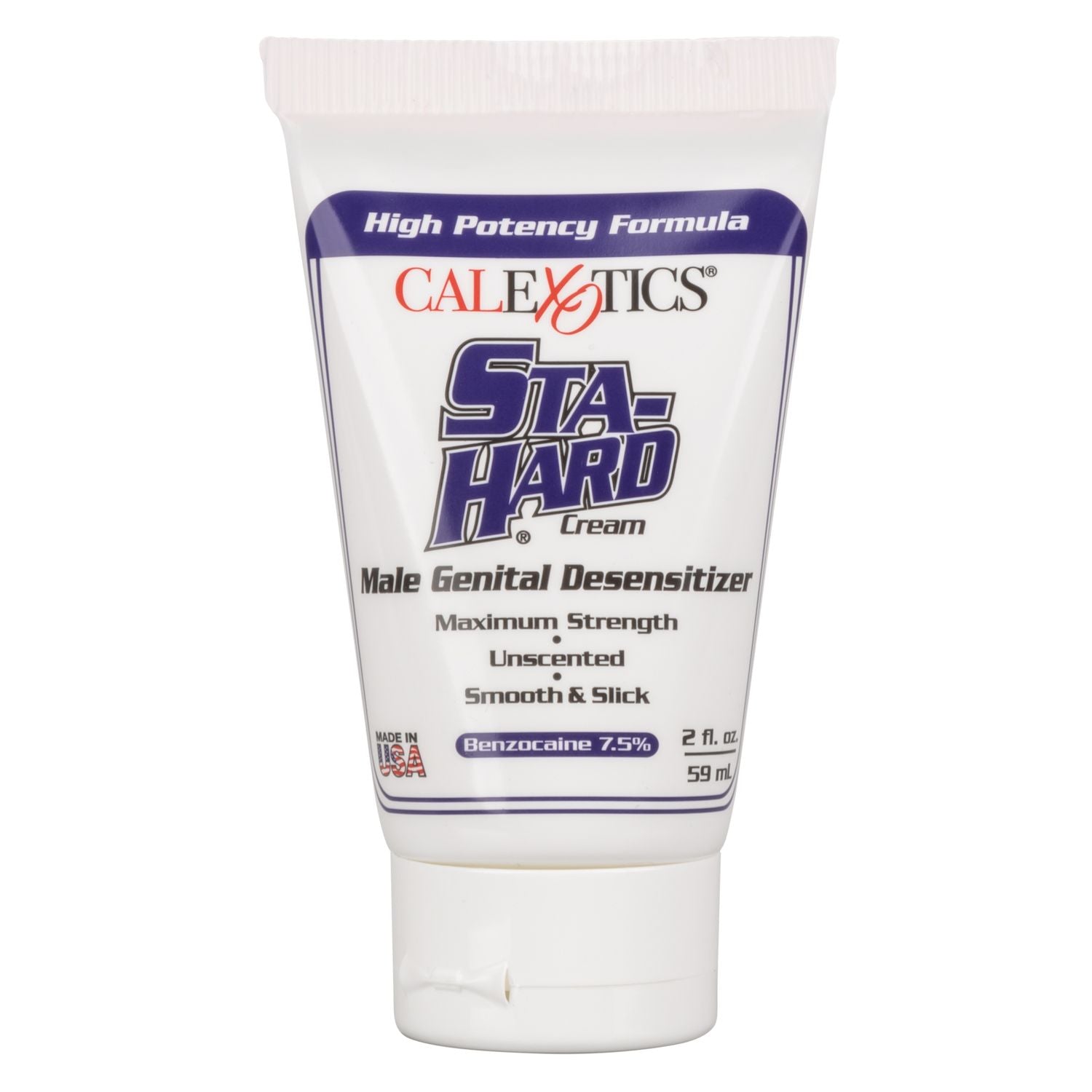 Features: High potency formula, unscented, smooth, slick. Unscented. Active ingredient 7.5% Benzocaine. Phthalate free. 1 year warranty. Measurements 2 fluid ounces. Bulk weight Package 1.5 ounces. Package 1 inches by 2.75 inches by 7 inches. Sta Hard Desensitizing Cream is a registered trademark for California Exotic Novelties. Sex toys and sexual wellness. Made in the USA. Categories: Erotic Body Lotions, Lubricants, Desensitizing Creams, Health and Beauty Aids, Massage Lotions, Creams. 2023.
