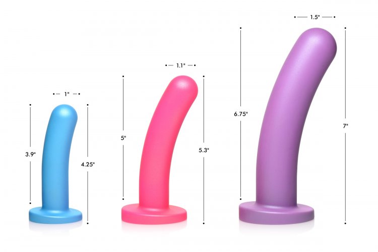 Strap U Triple Peg 28X Dildo Set Silicone with a Remote Control from XR Brands. Play with different sizes with this Triple Peg dildo set! The multi-colored dildos come in small, medium and large and each size has its own color so you can tell them apart at a glance! The Blue dildo, Pink dildo and Purple dildo are silky smooth, Premium Silicone that is phthalate free and body safe for worry free fun! The vibrating bullet can be inserted into any of the dildos at the base and is fully rechargeable via the magnetic USB charging cable included. Enjoy 4 speeds and 7 patterns of powerful vibration! To make things easy, a remote control is paired with the vibrator so you can adjust settings without ever having to take out or re-insert the vibrator. Have fun with pegging play with this triple dildo set! First, turn on the vibrating bullet and let it pair with the remote control. Insert into the dildo of your choice. After strapping either the small, medium or large dildo into your favorite harness, lubricate the dong well and use the same lubricant on your partner who is receiving the dildo. Go slowly as you play with size and girth, starting with the smallest dildo for beginners. Play with sizes as you both get more comfortable. Feel free to use the dildos on yourself, as well! Enjoy the powerful buzzing from Clean thoroughly between uses or use a condom to help keep things sanitary. After use, wash dildos with warm water and soap then spray with a toy cleaner and wipe dry. Recharge the bullet vibrator using the magnetic, USB cable provided. Replace remote control battery as needed. Measurements small dildo 4.25 inches overall length, 3.9 inches insertion length, 1 inch widest insertion diameter. Medium dildo 5.3 inches overall length, 5 inches insertion length, 1.1 inches widest insertion diameter. Large dildo 7 inches overall length, 6.75 inches. insertion length, 1.5 inches widest insertion diameter. Bullet Vibrator is 2.3 inches by 0.8 inch. Materials Silicone, ABS Plastic. Color Teal, Pink, Purple. Note Remote distance up to 32 feet; requires 1 CR2032 battery, included. Use with water based lubricant. Key features: