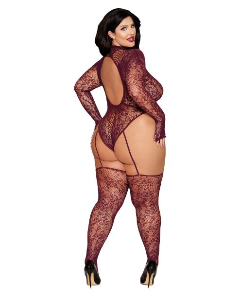 Seamless knitted lace teddy bodystocking, Plunging fishnet neckline detail, long sleeves and mock turtleneck with snap closure and large open back. High-leg teddy with attached elastic garters and matching lace thigh high stockings.