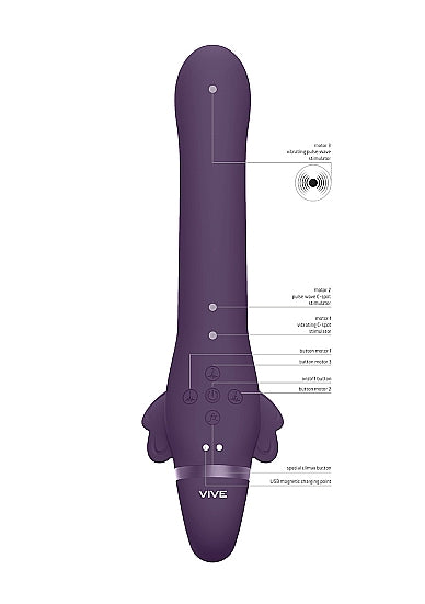 Vive Satu Purple Vibrator from Shots Toys. Satu is one of the most innovative vibrating strapless strap ons currently on the market. You can use it with your partner, while being stimulated yourself offering the best of both worlds! With three 10 function New Generation F1 Motors and its advanced technologies. All three motors can be independently controlled. One innovative 10 function NG F1 Pulse Wave motor for your partner. One 10 function NG F1 Vibrating Motor for clitoral stimulation. And one 10 function NG F1 Pulse Wave G-Spot motor for you. It is sure to bring you both to maximum heights of pleasure. This means you can set up your toy with up to 1,000 distinctive settings. Made from 100% silky smooth medical grade Silicone hypoallergenic. It is totally waterproof IPX7. Extremely quiet at under 60dB.This means you can use it wherever your heart desires! It contains a USB magnetic rechargeable Lithium ion battery, that when fully charged with its USB cable. It will provide 40 minutes of passionate play time. Just plug, charge and play! When you are getting close to climax, just one touch of the special function climax button will immediately bring all the motors to full power and, more importantly, bring both of you to an earth shattering orgasm. All Vive Vibrators have a full 1 year warranty to protect your investment.