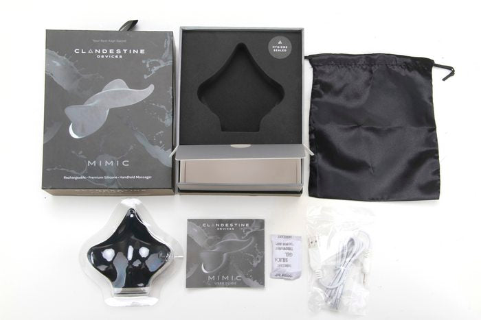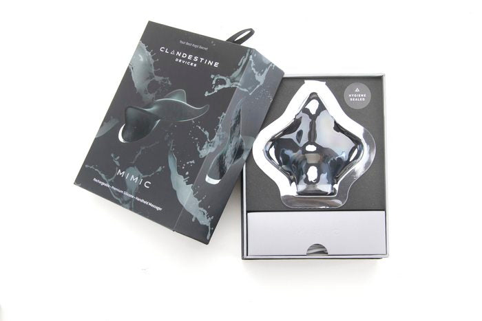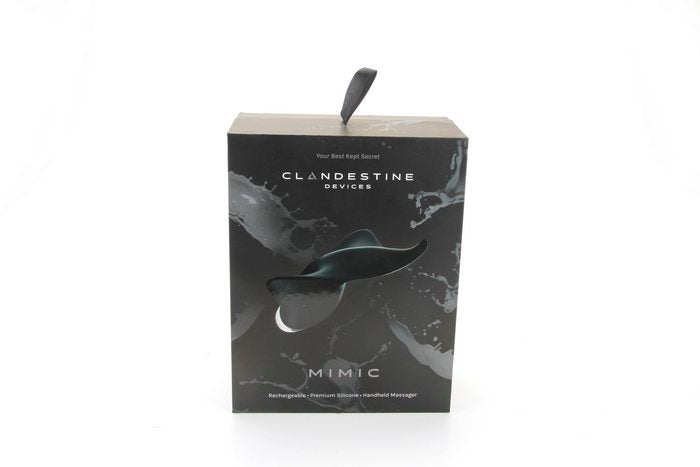 Clandestine Devices Mimic Massager Manta Ray shaped handheld is a sensory experience. Designed to be touched. Mimic took shape with the human form in mind. Acting like an extension of the hand, Mimic was designed with a user friendly interface, thoughtful colors, and features to ease use in the dark and underwater. It is not necessarily limited by gender, only the imagination. Mimic is unlike any other, it is soft, sleek, slender, and feminine. Mimic was crafted with comfort and pleasure in mind. Its unique, ergonomic shape fits perfectly in the curve of your hand. You can easily access the simple thumb controlled interface, which allows eight intense vibration patterns to travel to their pinpoint location or a more broad sensitive zone via the body, wings, and tip. Apply Mimic to the body to stimulate the clitoris, labia, and vulva. Massager is designed to hit multiple pleasure points at one time for a mind blowing sensation. Or use it with a partner. The thin device allows you to hold it between your bodies while being close for clitoral stimulation and penetration during intercourse. The USB rechargeable Mimic is waterproof for fun in and out of the water and easy cleanup. Vibrator features: 8 vibration patterns. Keeps things interesting. Made using body safe Silicone for your most sensitive parts. 100% waterproof. Enjoy anywhere. Travel lock make your journey memorable. LED Glow for when the lights go down. Discreet vibrations a secret worth keeping. USB Rechargeable. One year warranty provided by Clandestine Devices. Silicone shaft, ABS plastic base. 4.2 inches overall length. 1.5 inches top, 2 inches center by .75 inch top and .9 inch bottom.