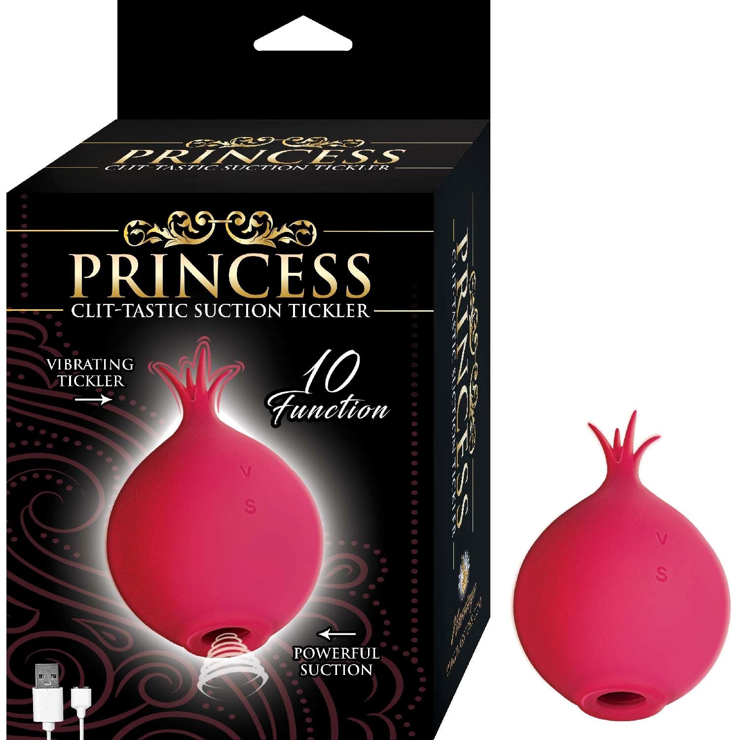 Princess Clit-Tastic Suction Tickler Specialty Vibrator Red from Nasstoys of New York. The powerful Clit-Tastic Suction Ticker her will stimulate you and your clit to breath taking orgasms with no contact, it is always ready to give you earth shattering orgasms. Made with popular Air-Pulse Technology, the soft Silicone attachment gently surrounds your clit, bringing you powerful climaxes with pressure waves. Or flip the toy over and enjoy the Silicone ticklers. The flickering tips do not just feel amazing on your clit, they are awesome for nipple play, teasing the labia, running along the shaft during a BJ, and more! This is the couples toy you have always wanted. Want a vibe, but not sure what you like yet? This toy is ideal for exploring different sensations. The ergonomic, easy to hold design also makes the Clit-Tastic Suction Tickler a discreet toy that does not have to be hidden away in your drawer. With 10 strong Air-Pulse speeds that are easy to use with control. The powerful Clit-Tastic Suction Tickerle is an Eco-friendly intimate pleasure device since the vibrator is rechargeable and you never have to buy batteries ever again. The charger for the adult toy is magnetic so there are no holes in the Silicone to allow moisture in when you need to charge. Fantastic! The Clit-Tastic Suction Tickler is great for people with limited mobility or a disability since you do not have to thrust or move the toy like a traditional sex toy. Fantastic! Made from Silicone, this toy is body safe and a great choice for everyone. Just add your favorite water based lubricant and have a good time. After use, carefully wash the toy with mild soap and water, or try a Toy Cleaner for even quicker clean up.