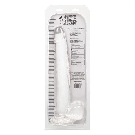Size Queen 12 inches Ivory Light Skin Dildo from California Exotic Novelties. For the Size Queen who knows exactly what they want, the 12 inches Size Queen is a full 12 inches long, with a 14.25 inches over all size of life like pleasure. The 12 inches dong is firm yet flexible feel and will ensure you receive exactly what you are looking for, including a realistic head and veins. With a sturdy, suction cup base you can have your play on a chair, in the shower or anywhere you desire that has a firm and non-porous surface. Stop settling for the small stuff. Go after what you really want the extra large, 12 inches Size Queen. It is sure to hit the spot. The hand washable design ensures you endless hours of pleasure. Compatible with nearly all harnesses, the Size Queen 12 inches will fully deliver an erotic, life like experience you will not forget.