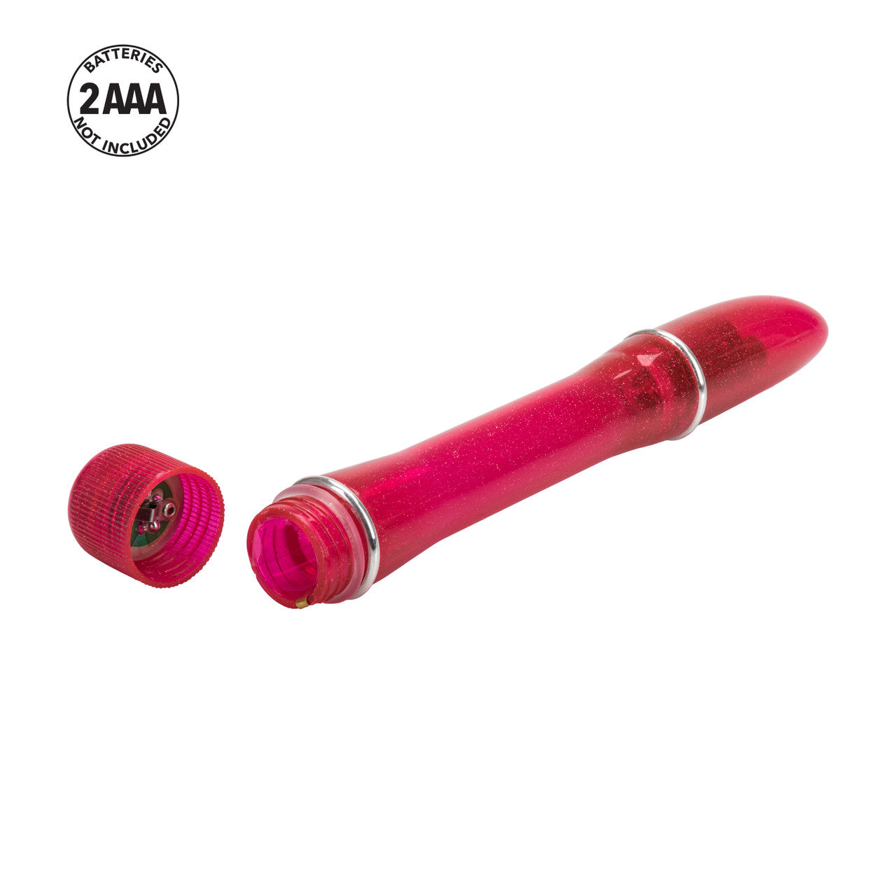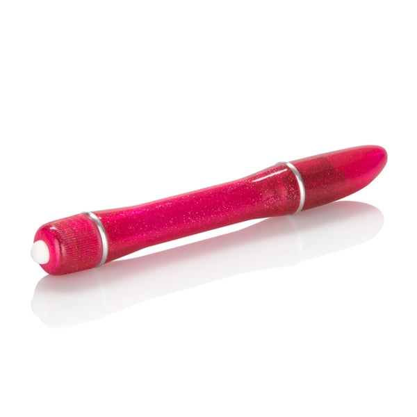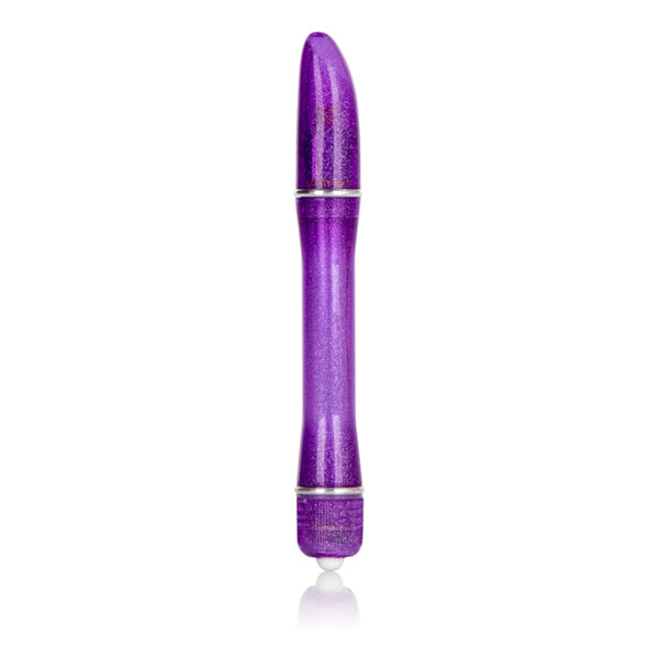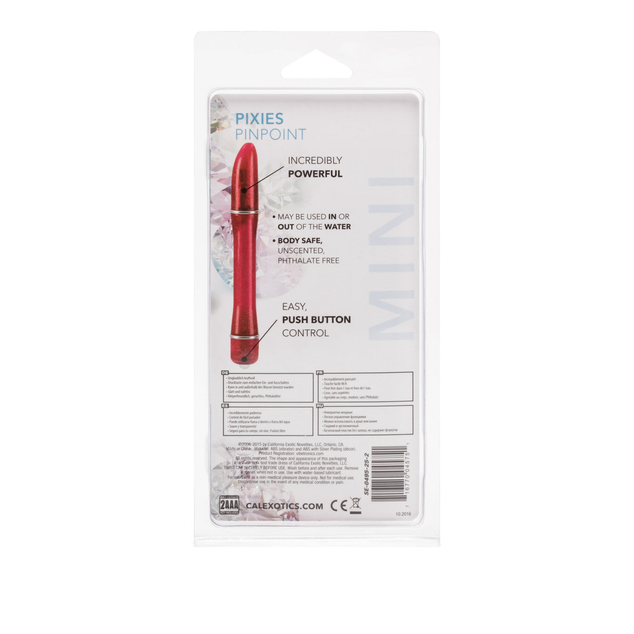 Waterproof Pixies Pinpoint Vibrator. Power packed petite waterproof vibrating massager pinponts any pleasure zone. Safe and pure for body and pleasure. Made with durable and easy to clean plastic, this massager has a sparkling shimmer while the contoured shape supplies total stimulation. The wand-like design makes it easy to control and grip. A single push-button activation directs the vibrations and the waterproof construction makes it fun in the shower or bath. Vibrator measures 5 inches long by .75 inch wide. Bulk weight 0.9 ounce. Vibrating sex toy requires 2 AAA batteries not included. Do not leave batteries in the vibrator between uses. A water based lubricant is recommended. Always clean before and after use. Pixies Pinpoint Vibes hold the US Patent # D450952. Pixies Pinpoint Vibes is a registered trademark for California Exotic Novelties. Sex toys and sexual wellness. New images added May 5, 2013.