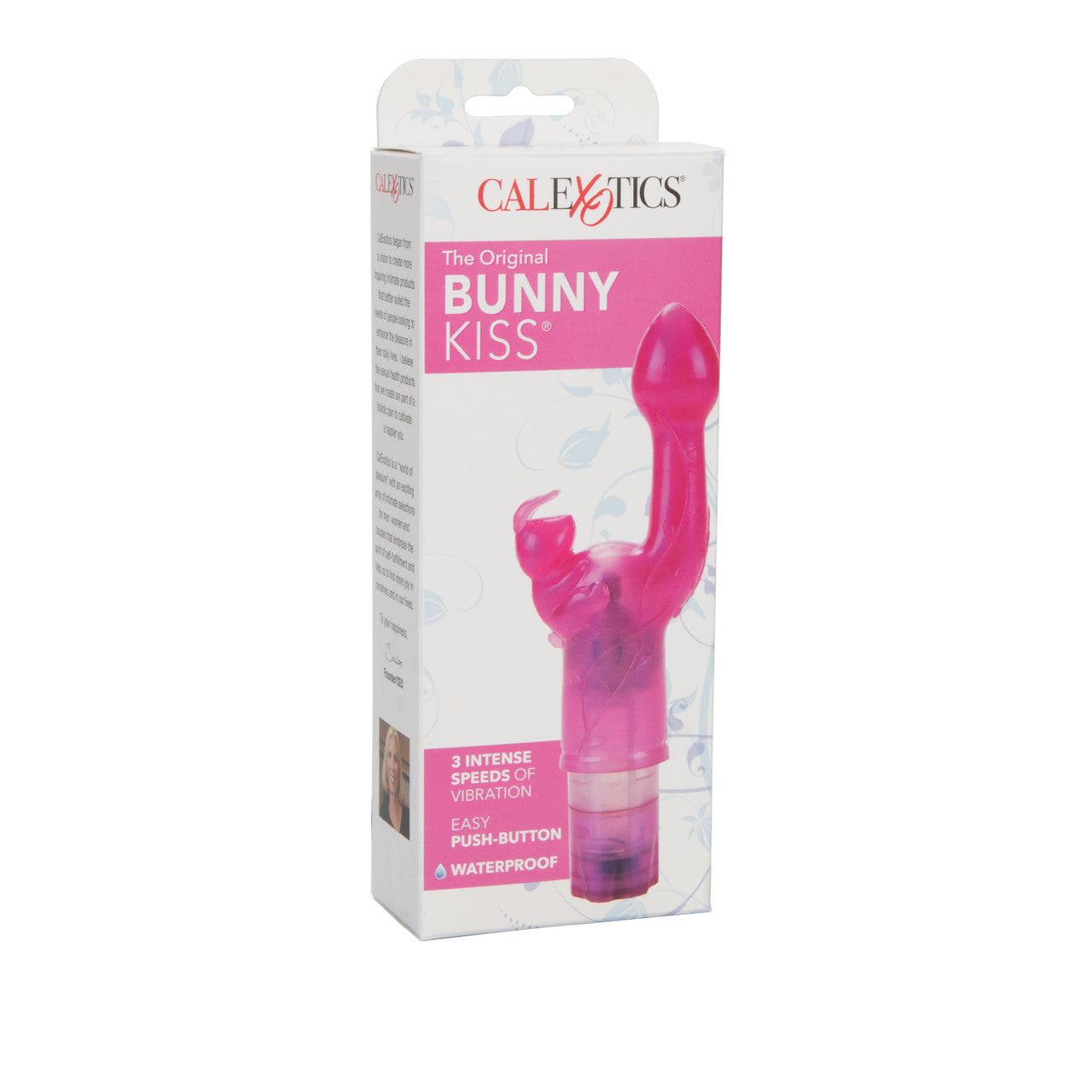 The Original Bunny Kiss Vibrator. The ultimate in female arousal! Dual stimulating vibrator features a non-phallic shaft for internal vagina and g-spot arousal and a small rabbit for external clitoral arousal. Ultimate bouncing bunny with flickering ears. Ergonomically designed for G-spot stimulation. 3-speeds of intense power. Easy push button control. Sized for beginners and advanced users. Safe and pure for body and pleasure. Made using phthalate free, non-toxic materials: Thermoplastic Rubber TPR massager, ABS plastic cap. Vibrating sex toy requires 2 AAA batteries, not included. Do not leave batteries in the vibrator between uses. Vibrator measures 2.75 inches long by 1.25 inches wide. Bulk weight 4.0 ounces. A water based lubricant is recommended. Always clean before and after use. Category: New Items, For Women, Vibrator, Vibrators. The Original Bunny Kiss Vibrator is a registered trademark for California Exotic Novelties. Sex toys and sexual wellness. New images added June 9, 2013. Colors may vary.
