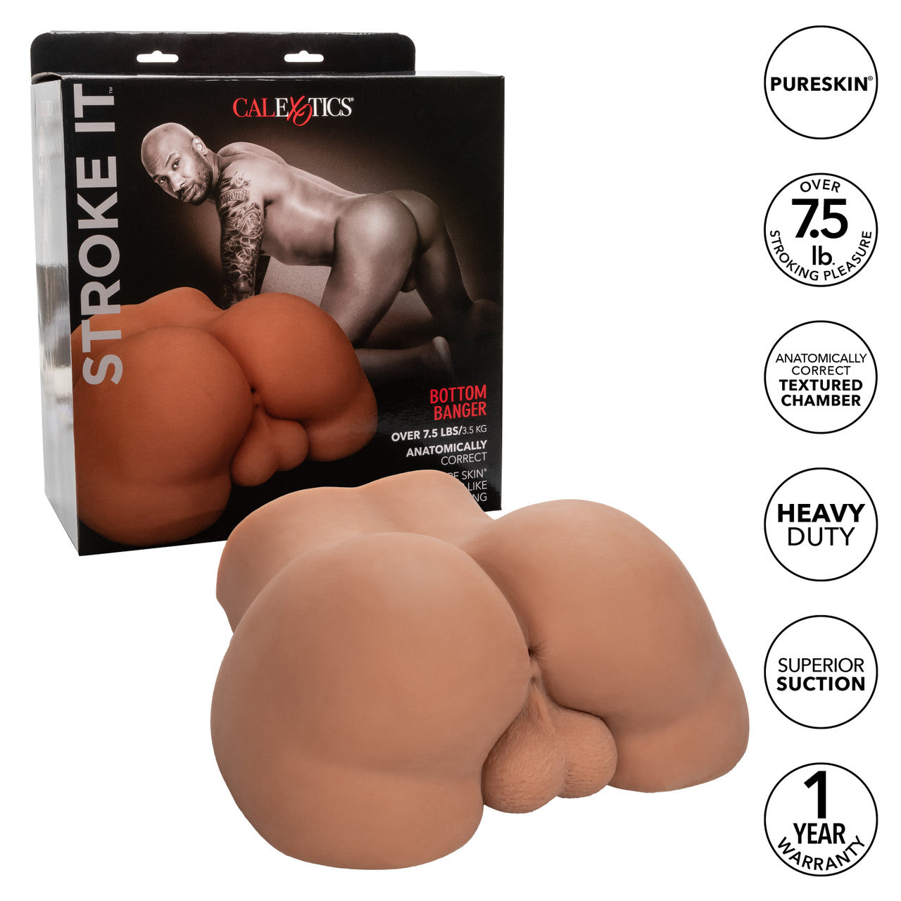 Stroke It Bottom Banger Ass Ivory Beige Male Masturbator Pleasure Toys from California Exotic Novelties. Anatomically correct. The Stroke It collection brings you the Bottom Banger, meant to thrill with a real feel stroking experience. Dive deep into over 7.5 pounds of heavy duty stroking pleasure with a realistic pleasure chamber and life like design. The life like feel and ultra tight, textured chamber takes power bottom to a whole new level to create a wonderland of pleasure for any member willing to slip inside. The plump stroker ass is great for anyone wanting a little more from their pleasure play with realistic balls and luscious round ass design. Over 7.5 pounds of Pure Skin material make for the truly heavy duty, pounding pleasure you have been craving. Pure Skin is a super soft, ultra stretchy material with a unique, life like feel delivering pure satisfaction in every stroke. This durable sleeve is easy to use and requires no special care.