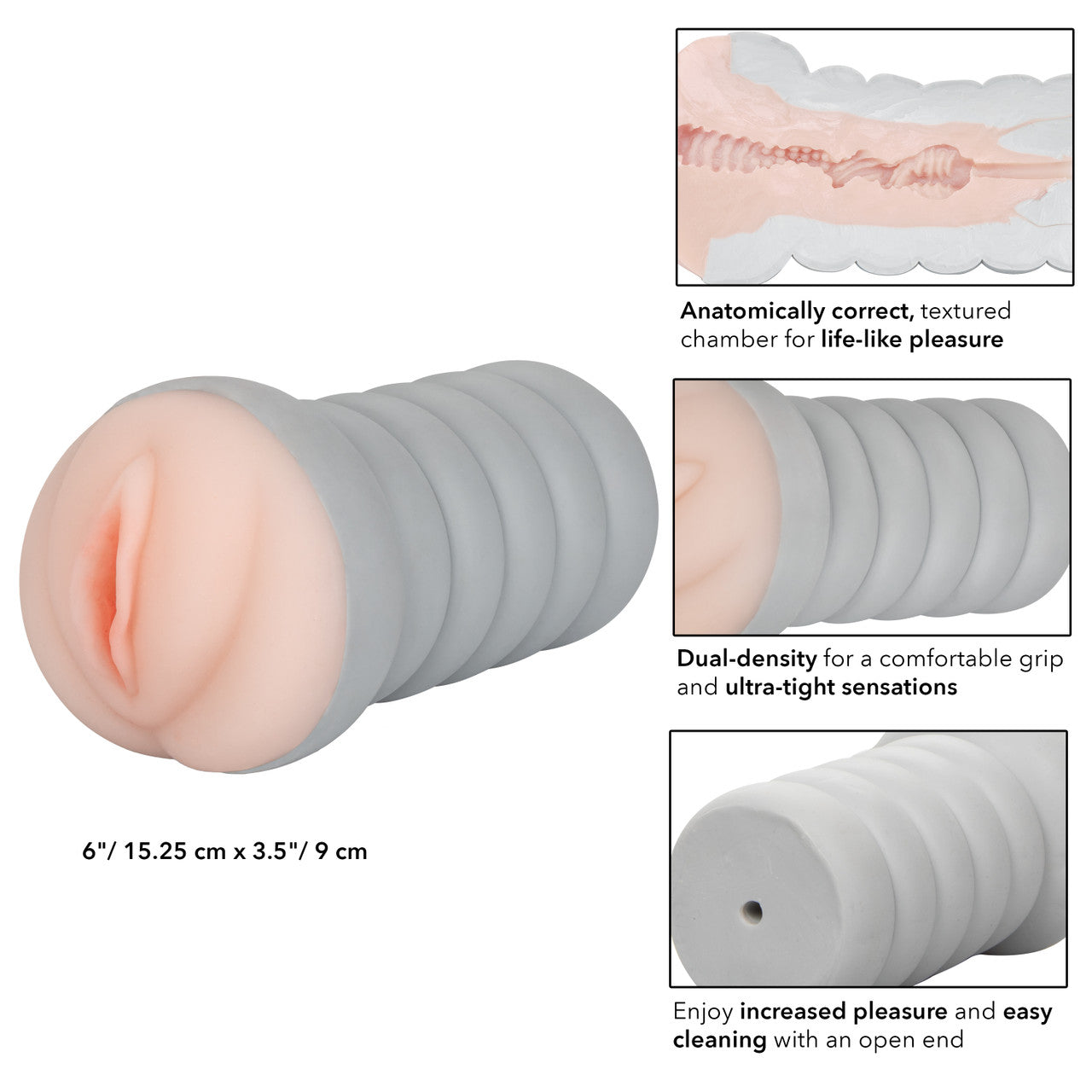 Ribbed Gripper Tight Pussy Ivory Beige Stroker from California Exotic Novelties. Heavy duty life like masturbator. Materials Thermoplastic Rubber TPR. Dual density. Over a pound of stroking pleasure. Pure Skin material.